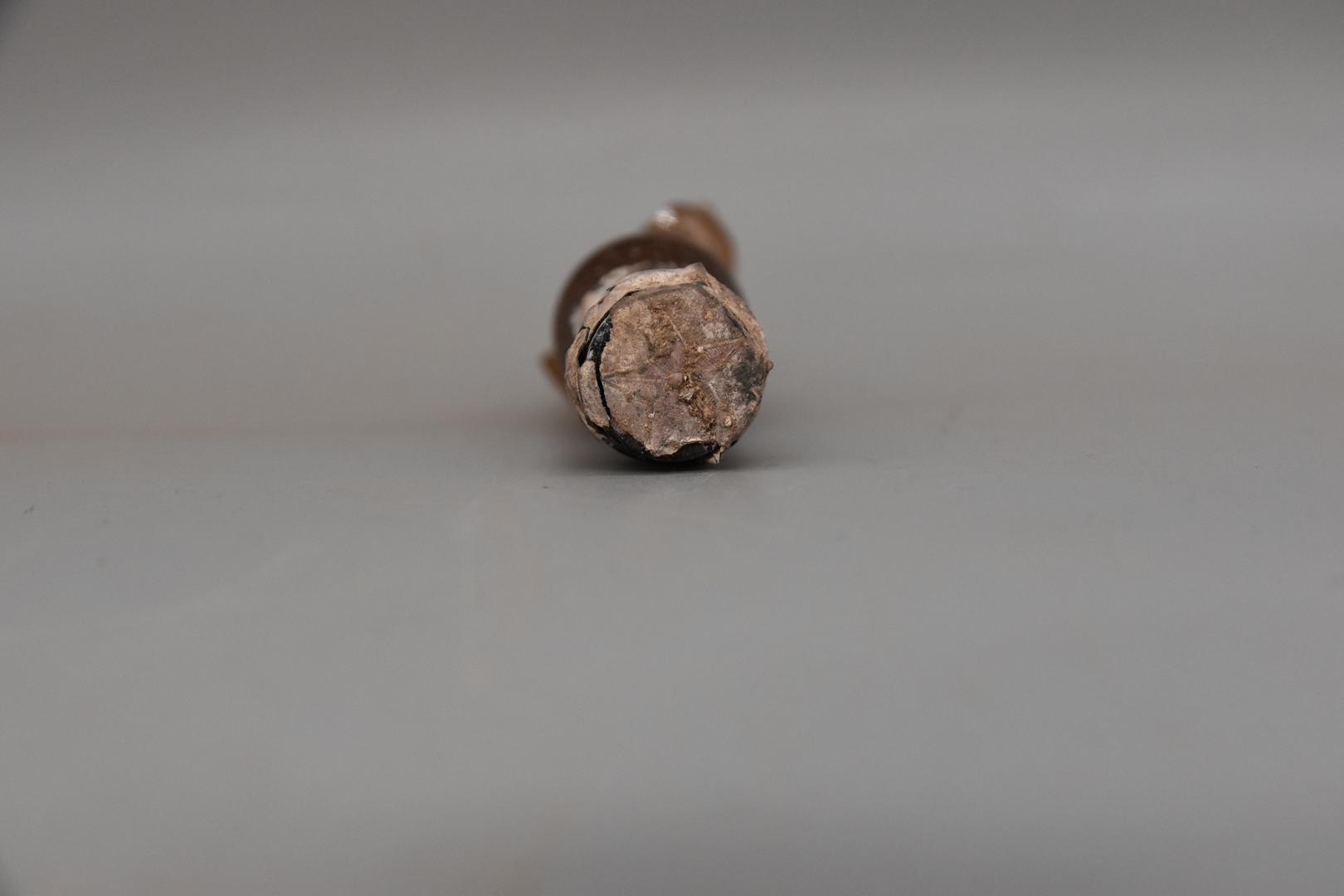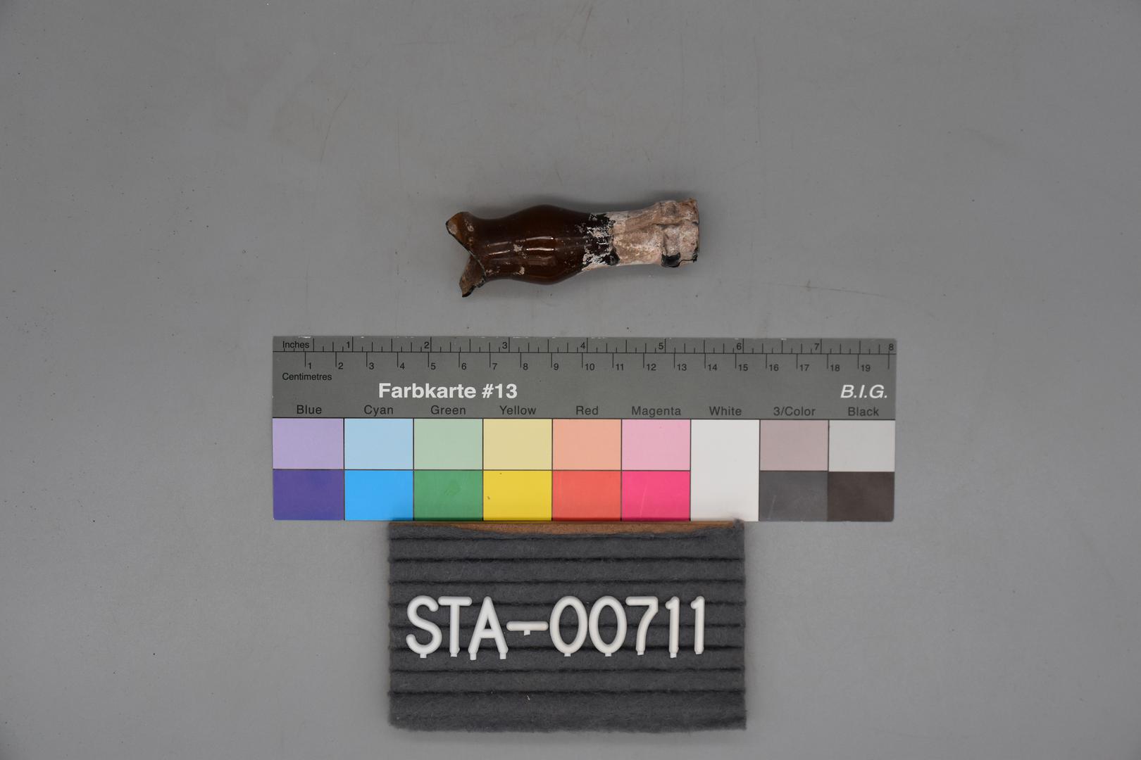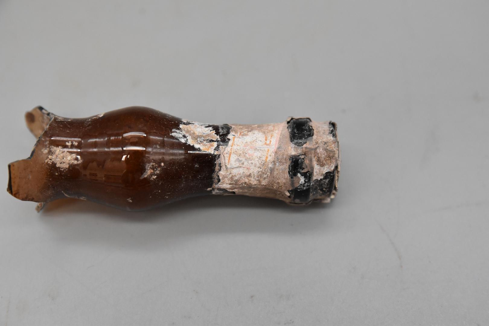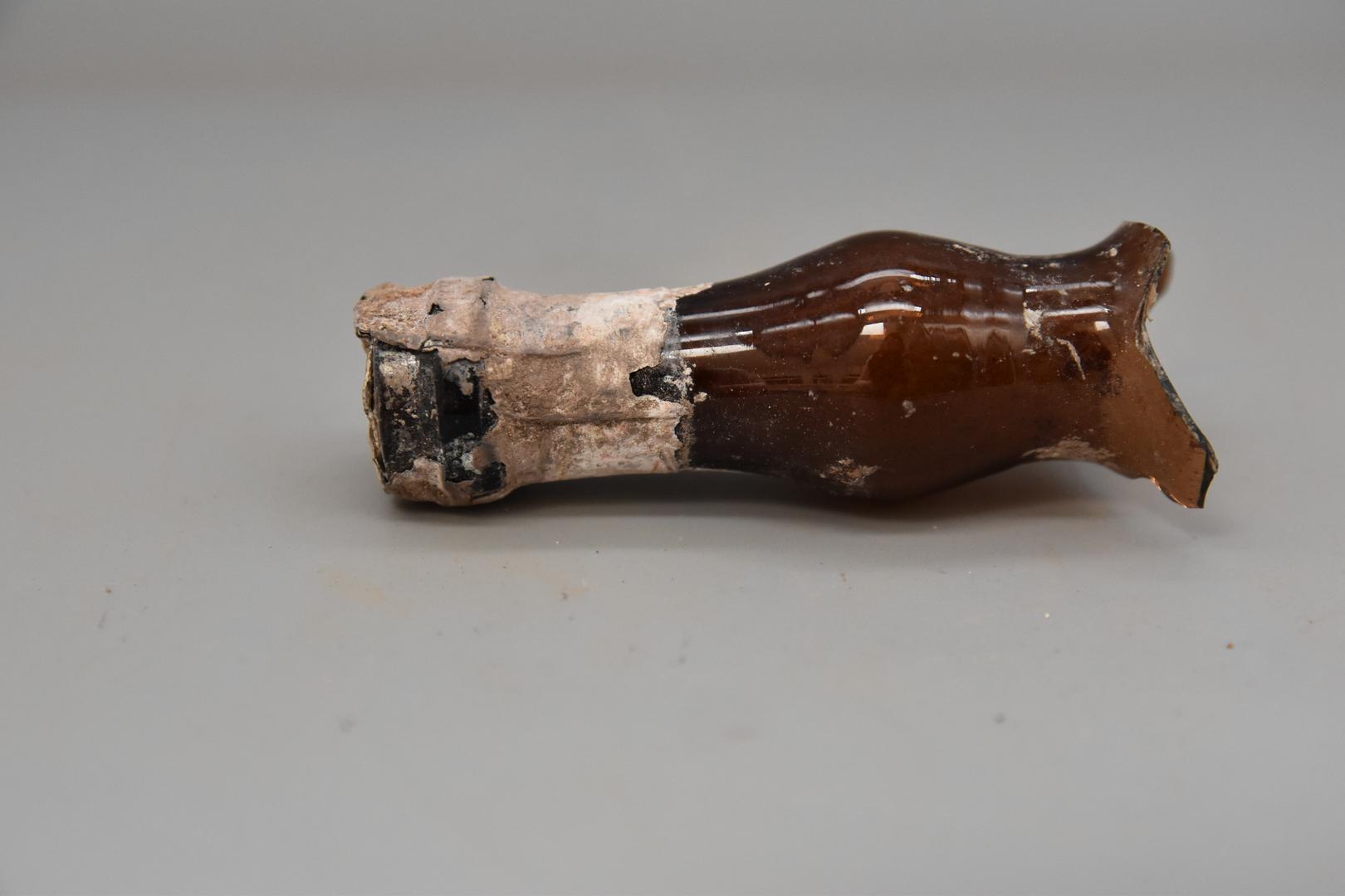 Es handelt sich um einen Kopf einer braunen Flasche. Die Form ist länglich, mit einer schmalen, profilierten Mündung. Der Hals ist lang und nach außen gewölbt. Die Flasche ist an der Schulterzone gebrochen. An der Mündung befinden sich Verpackungsreste eines rot weißen Etiketts. Auf der Oberseite ist ein roter Stern sichtbar. Ein Korken ist noch erhalten.