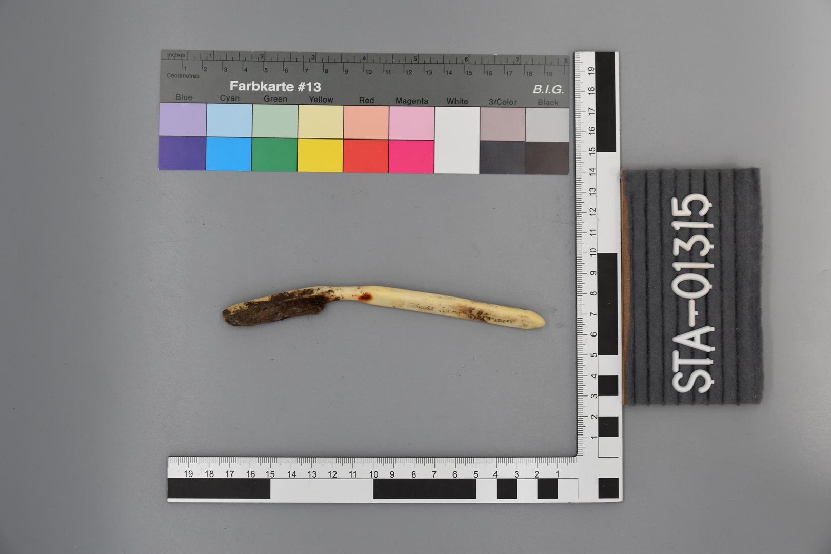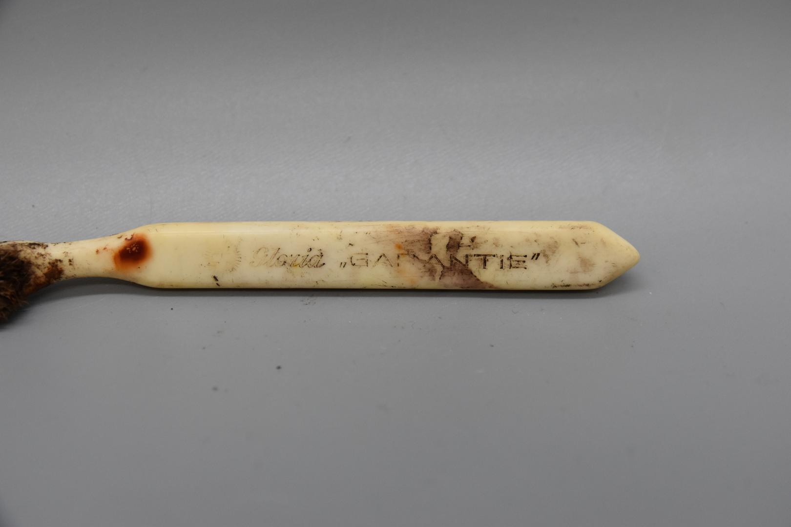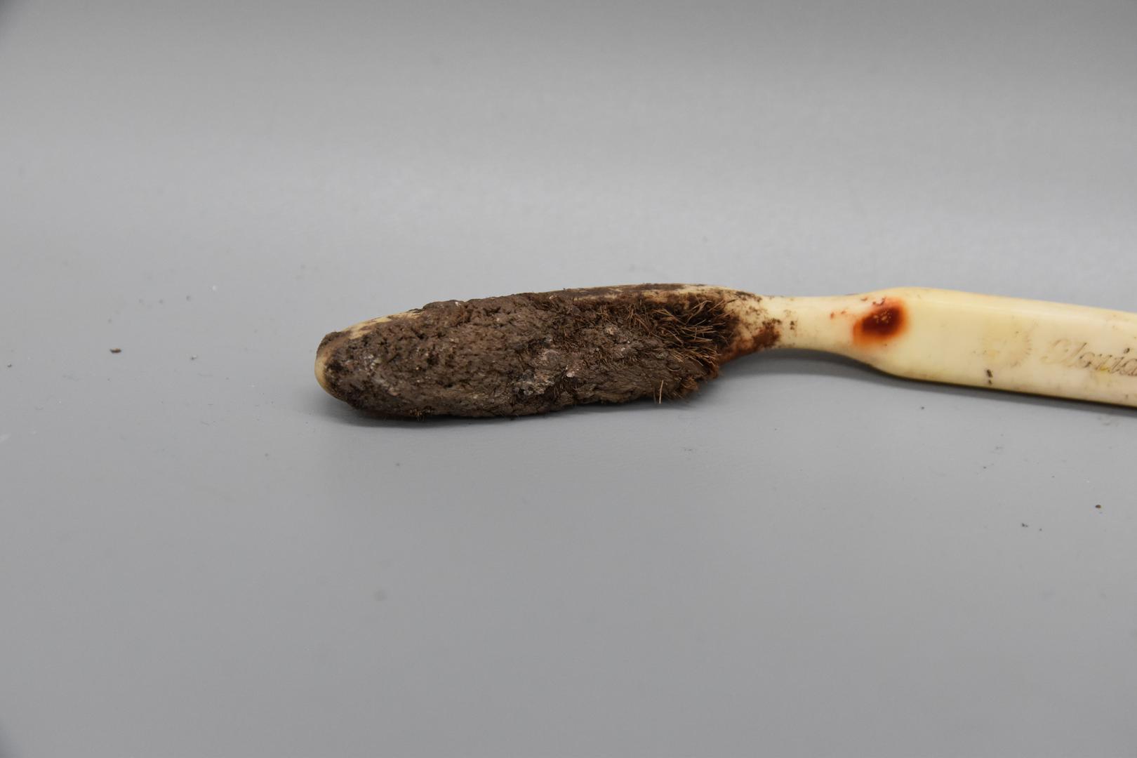 "de": "Die Zahnbürste ist rechteckig und die Kanten sind abgerundet. Zwischen Kopf und Griff ist der Hals eingezogen. Auf einer Seite des Griffes ist eine Kennzeichnung. Der Bürstenkopf ist leicht angewinkelt und enthält noch Borsten. Das Griffende ist spitz zusammenlaufend."