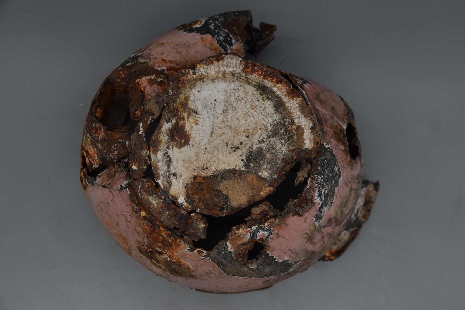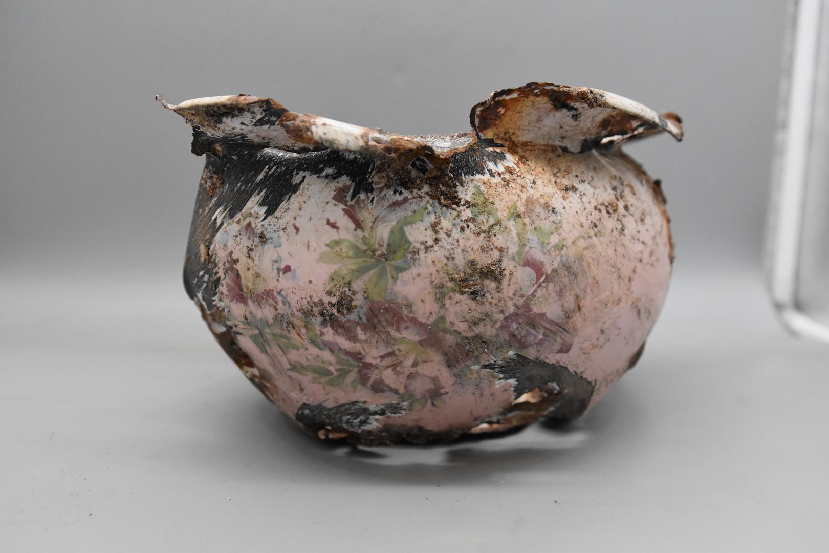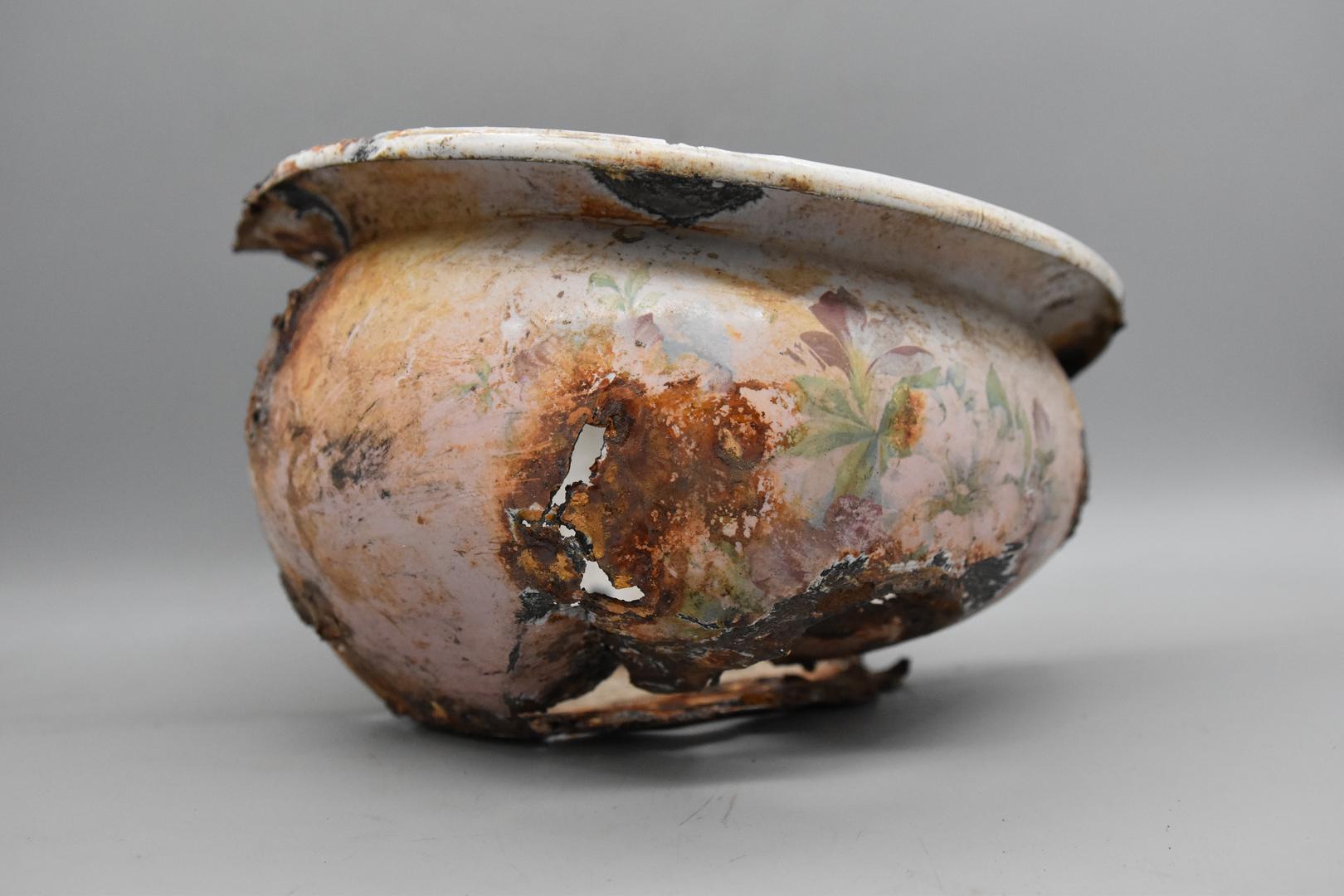 Der Emailtopf ist innen und am Boden weiß und außen ist er rosarot und mit einem Blumenmotiv rundherum verziert. Der Rand ist nach unten gezogen. Der Körper ist bauchig geformt und verjüngt sich nach unten. Der Boden besitzt einen Standfuß mit einem flachen Boden. Auf einer Seite sind noch Spuren von einem vertikalen Henkel sichtbar.