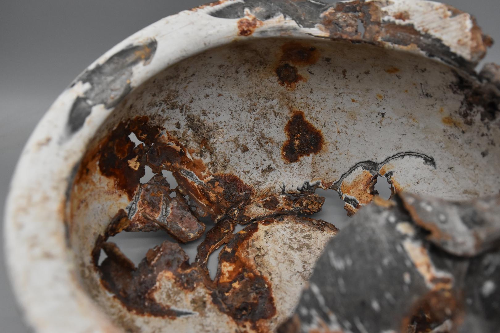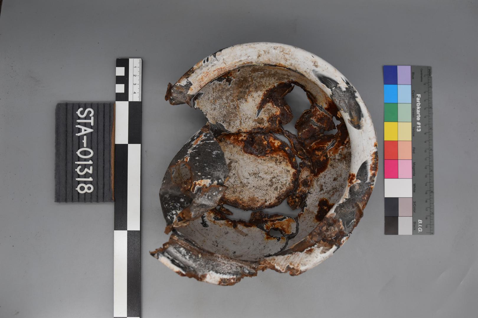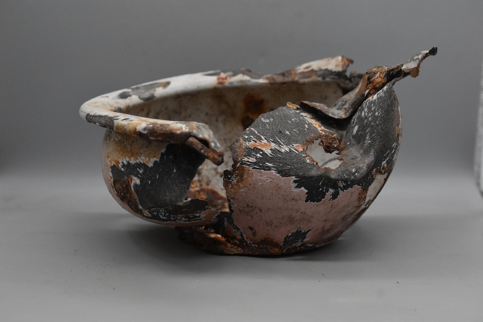 Der Emailtopf ist innen und am Boden weiß und außen ist er rosarot und mit einem Blumenmotiv rundherum verziert. Der Rand ist nach unten gezogen. Der Körper ist bauchig geformt und verjüngt sich nach unten. Der Boden besitzt einen Standfuß mit einem flachen Boden. Auf einer Seite sind noch Spuren von einem vertikalen Henkel sichtbar.
