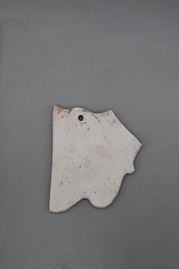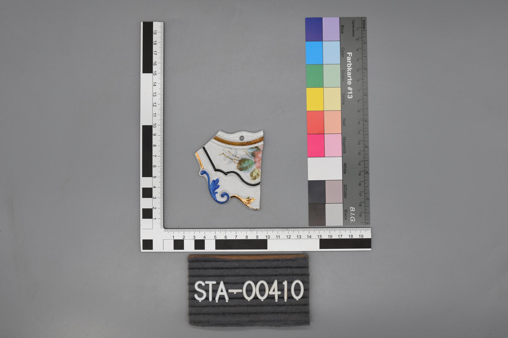 "de": "Das Wanddekorfragment ist aus Porzellan gearbeitet und weiß glasiert. Die Hinterseite ist unglasiert. Am oberen Bereich ist ein Loch eingearbeitet. Das Objekt ist auf der Oberseite mit goldener, schwarzer, und blauer Farbe verziert und hat ein Rosenmotiv mit Blüten, Blättern und Stielen, sowie ein verschnörkeltes Randmotiv."