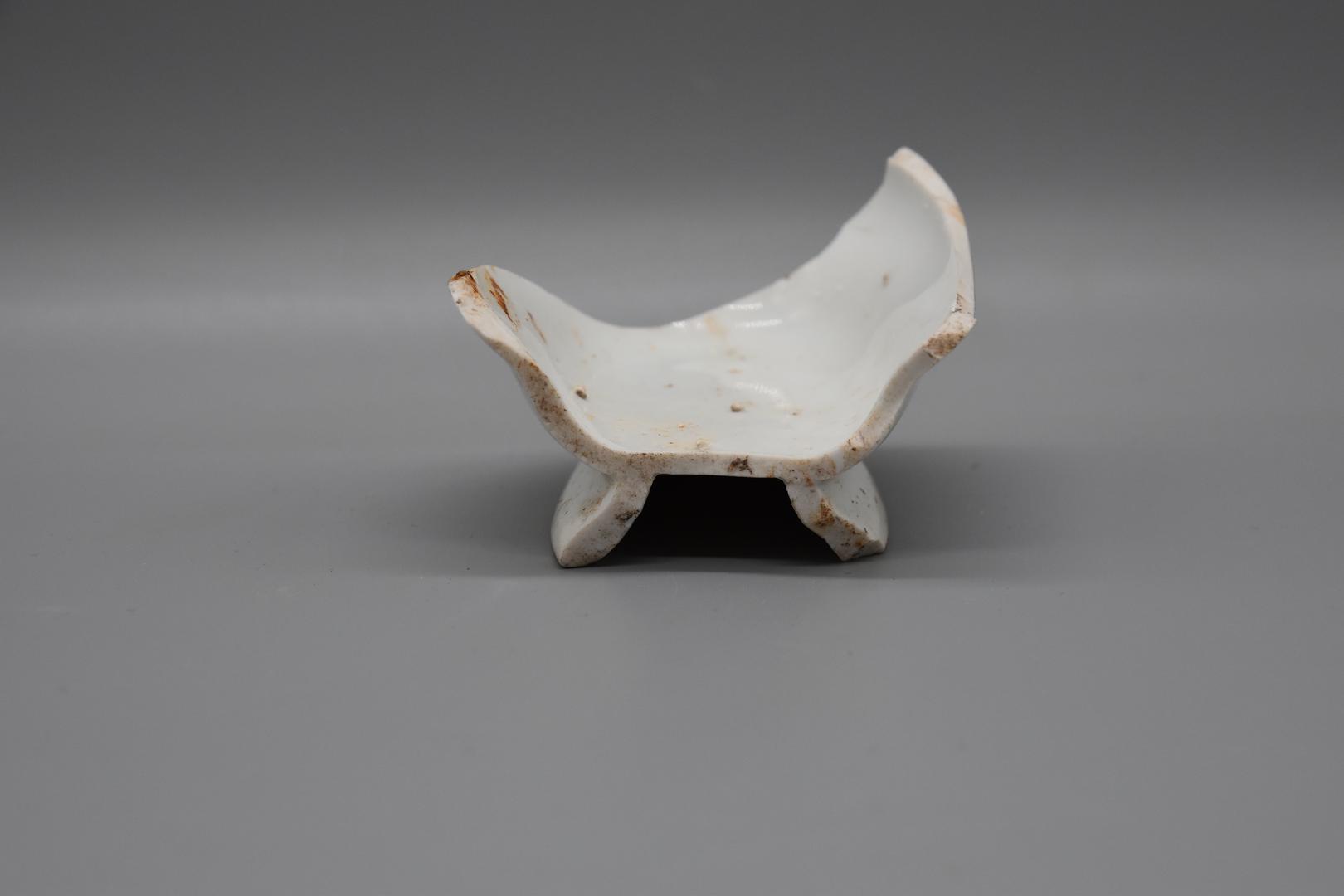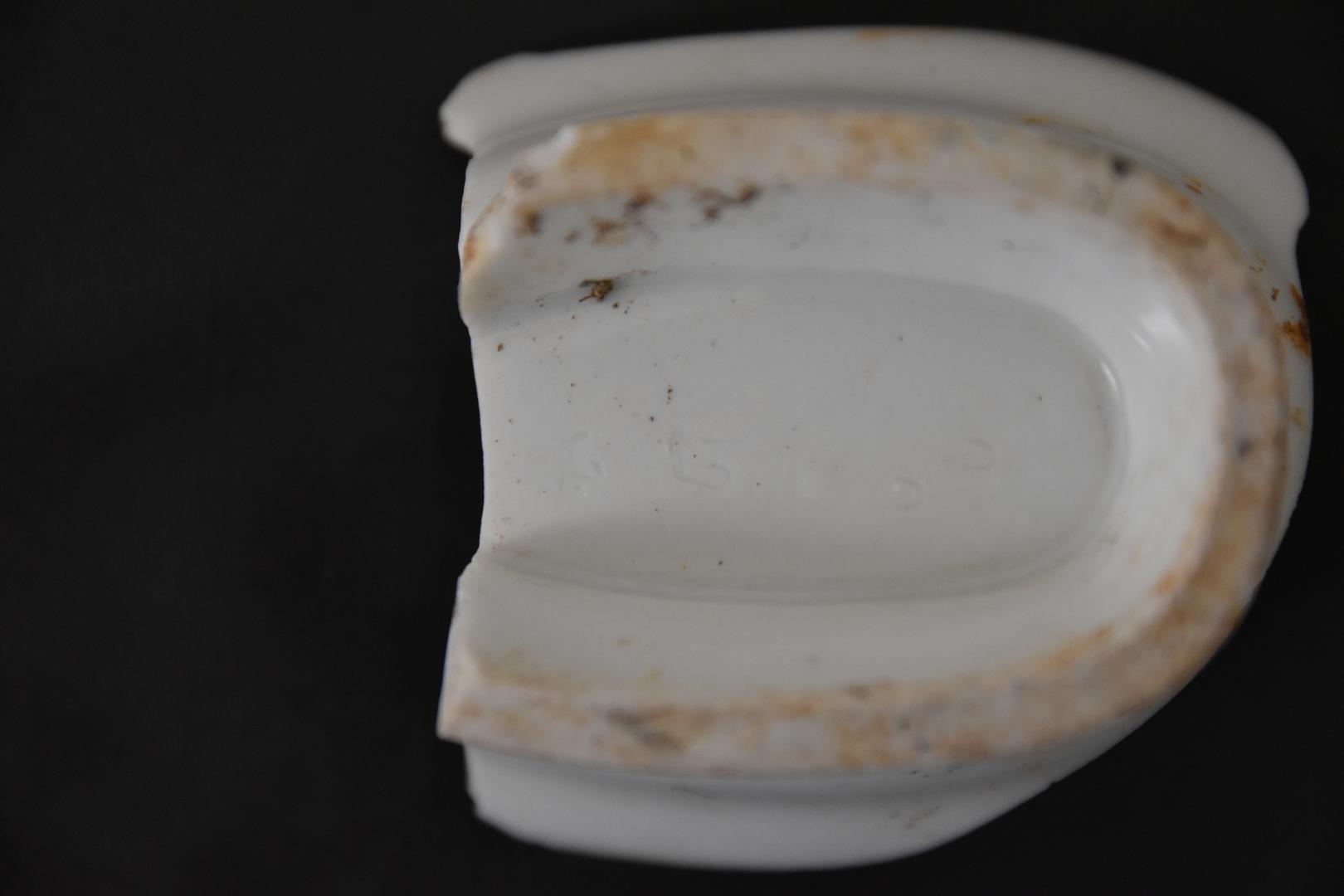 "de": "Die Saucière aus Porzellan ist oval geformt und besitzt einen Standring der ebenso oval ist. Die Farbe und Glasur sind weiß mit einer glatten Oberfläche. Am Boden befindet sich die Kennzeichnung \"24\"."
