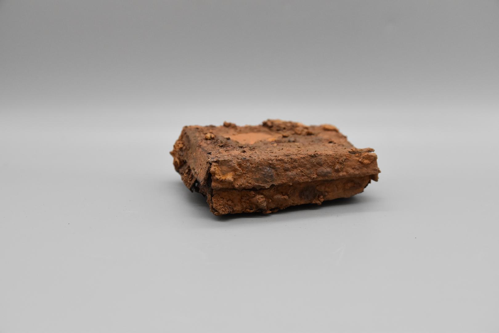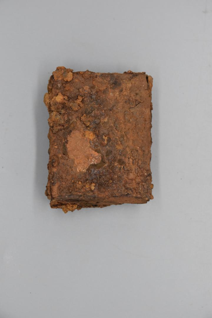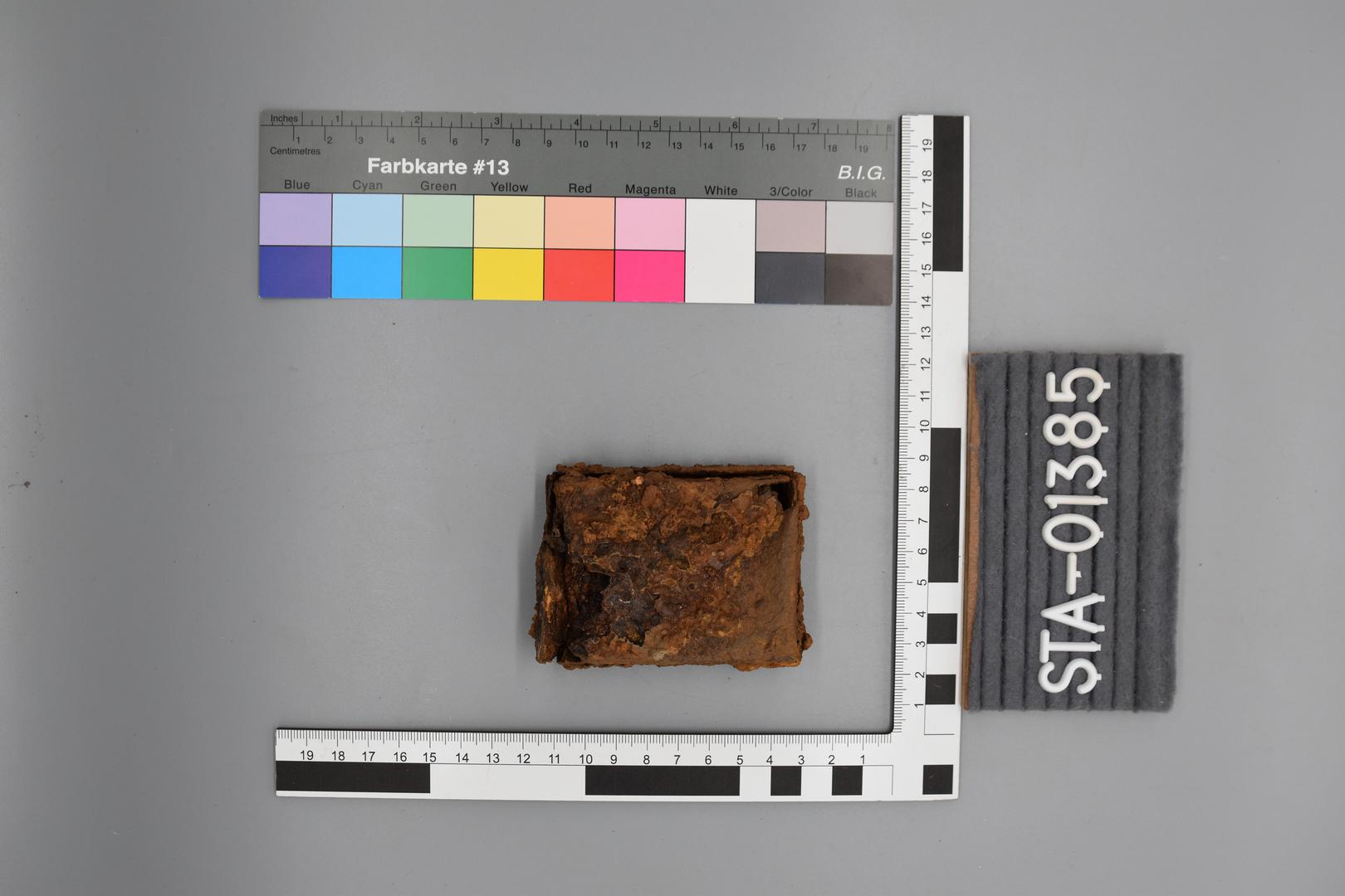 Die Metalldose ist rechteckig und flach. Der Deckel ist durch Korrosion fest verwachsen.
