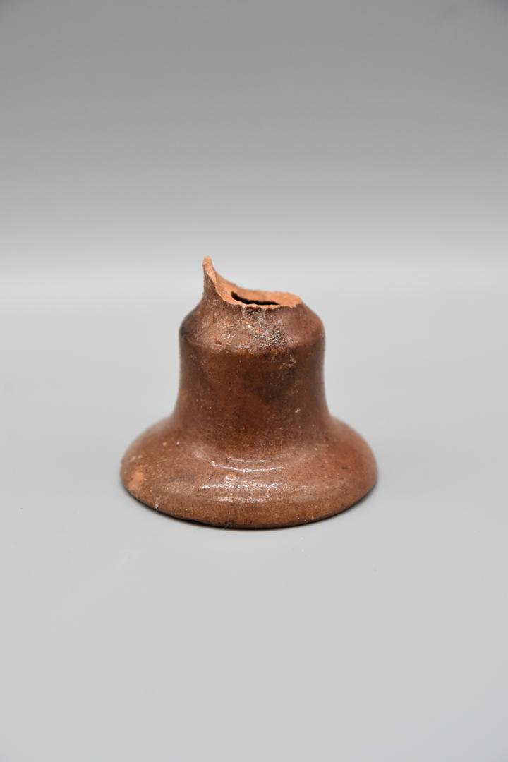 Der Kerzenständer ist aus Irdenware. Die Form ist rund und glockenförmig. Die Irdenware ist mittelbraun glasiert. Das Objekt ist innen hohl und oben abgebrochen. Es könnte sich auch um ein kleines Keramikglöckchen handeln.