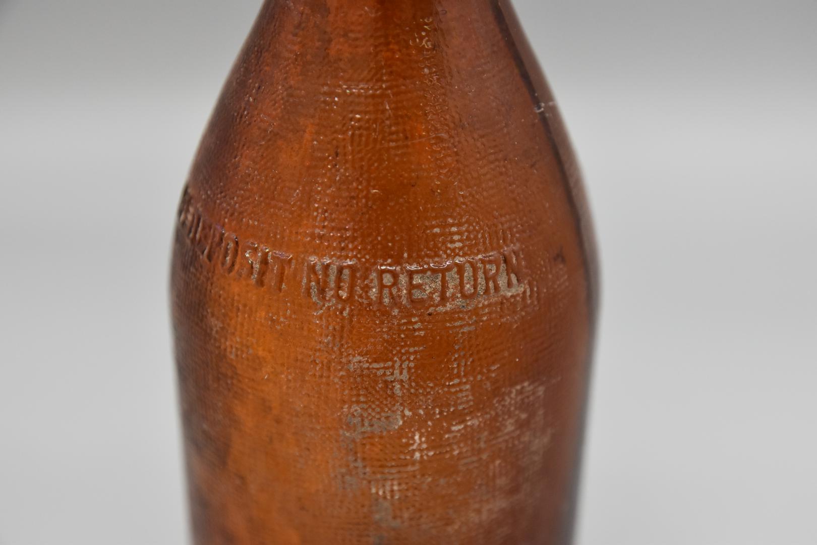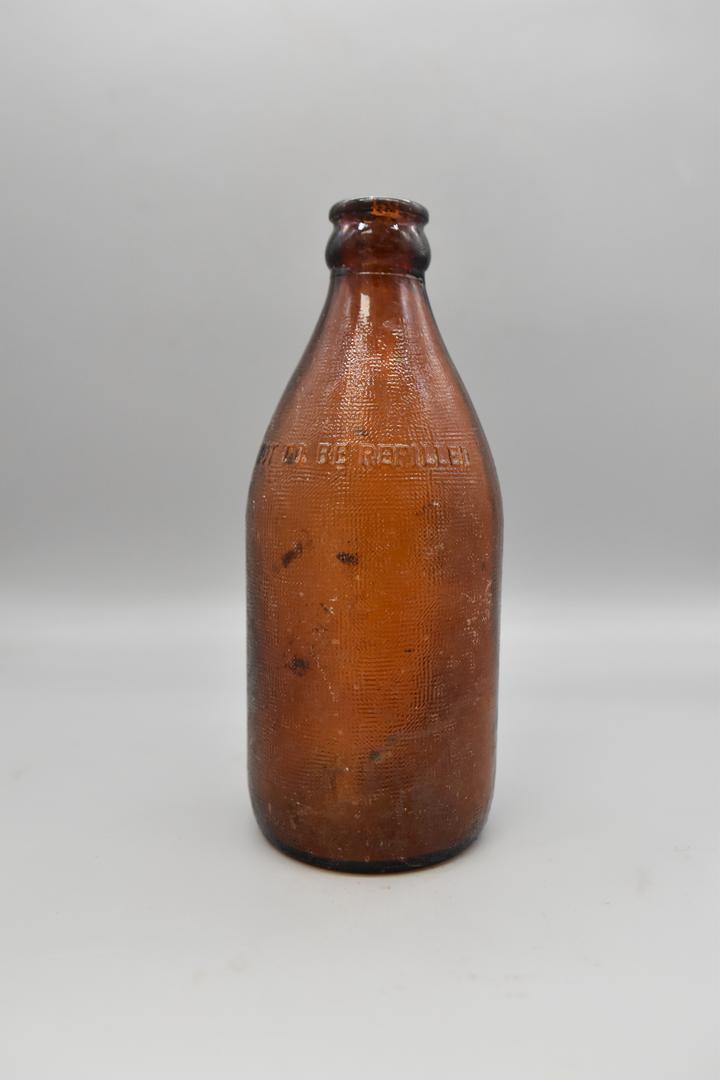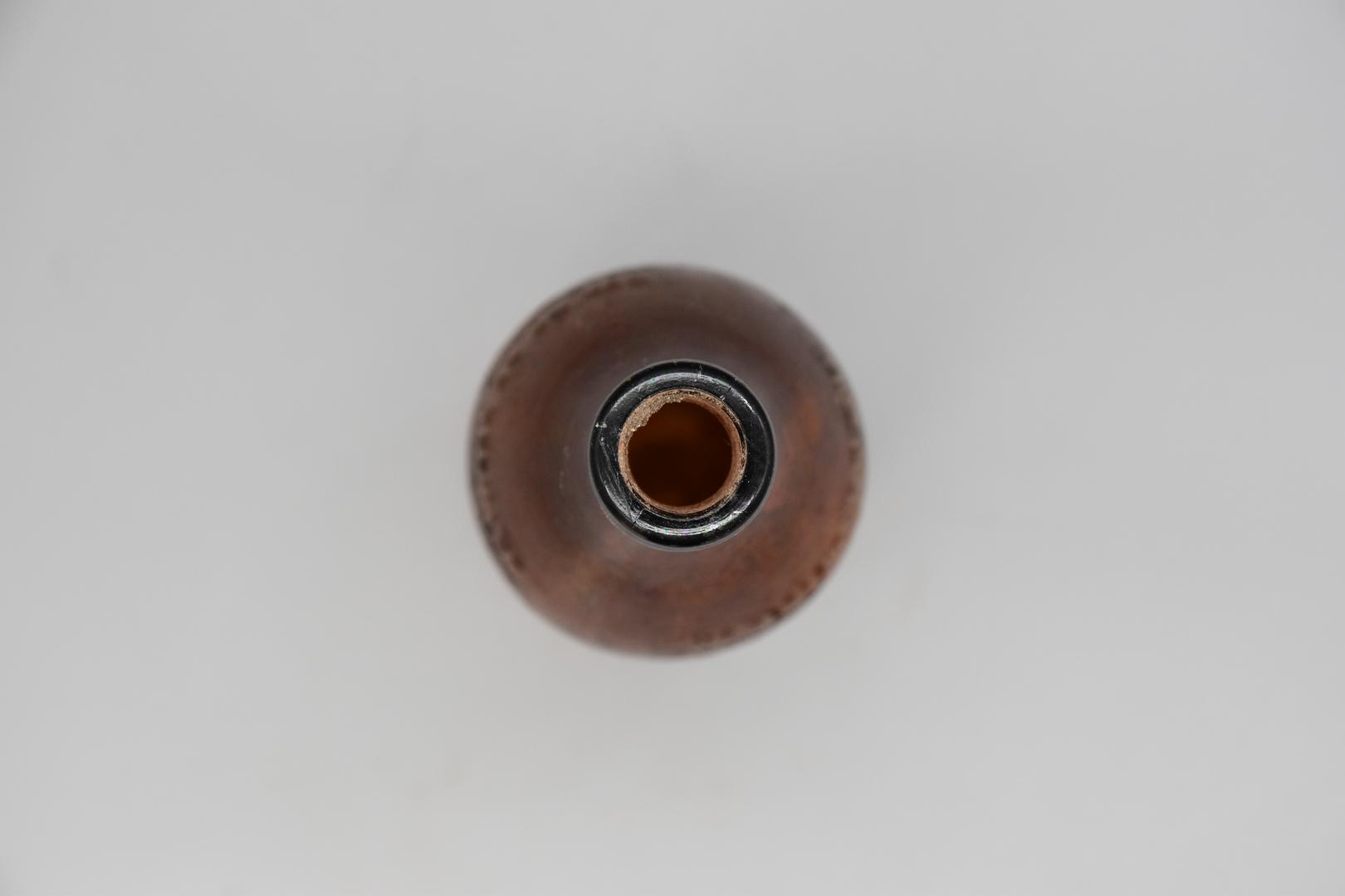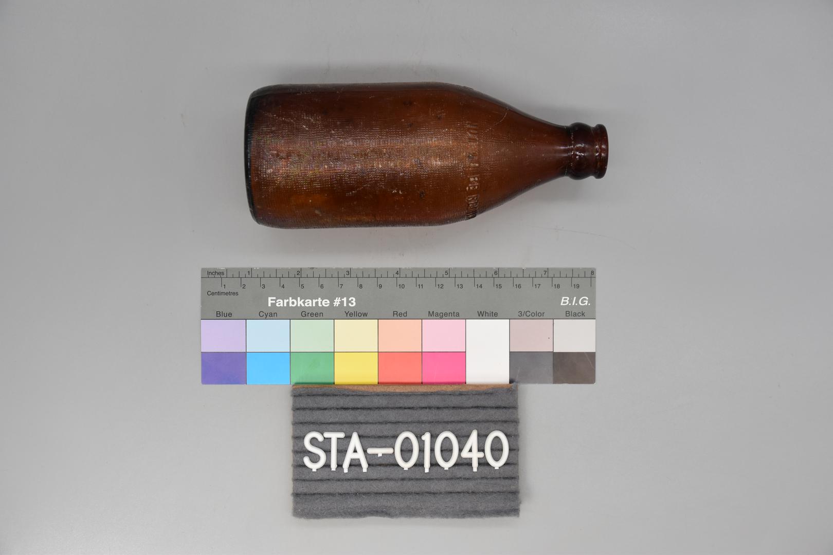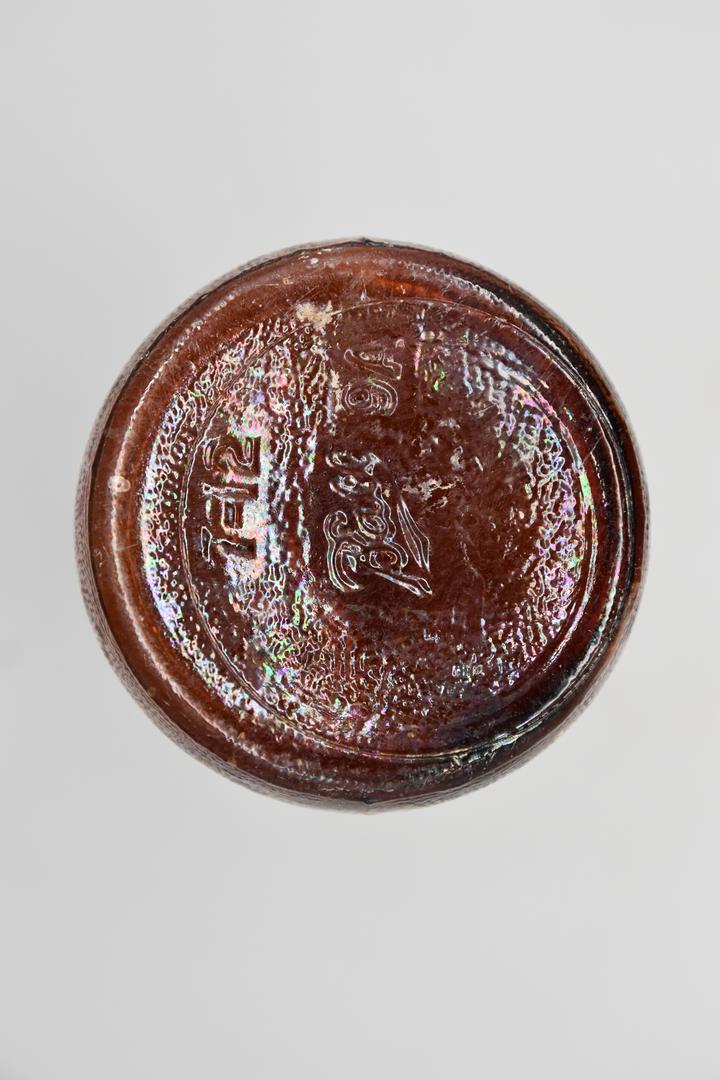 Die braune und zylindrische Flasche hat eine verdickte Mündung, der Hals erweitert sich nach unten und die Schulter ist steil abfallend. In der Bauchzone ist die Flasche genoppt. Der Boden ist leicht konkav.