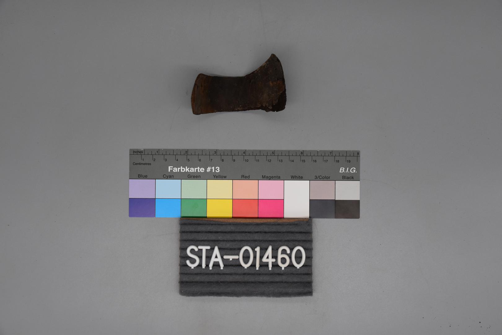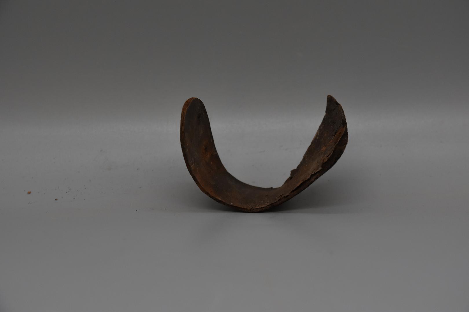 Eine dunkelgraue Ledersohle für Kinderschuhe. Eine Seite ist abgerundet, die andere gerade geschnitten. Sie ist in der Mitte schmal und wird zu den Enden hin breiter. Am geraden Ende befinden sich vier runde Vertiefungen, von denen eine noch einen Metallnagel enthält. Die Sohle ist sehr stark gewölbt.