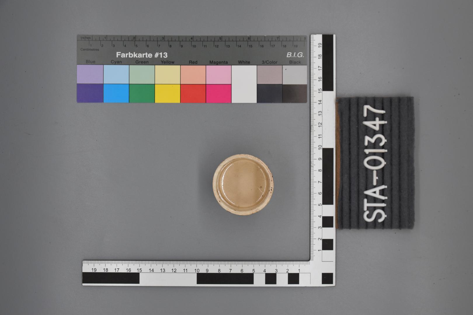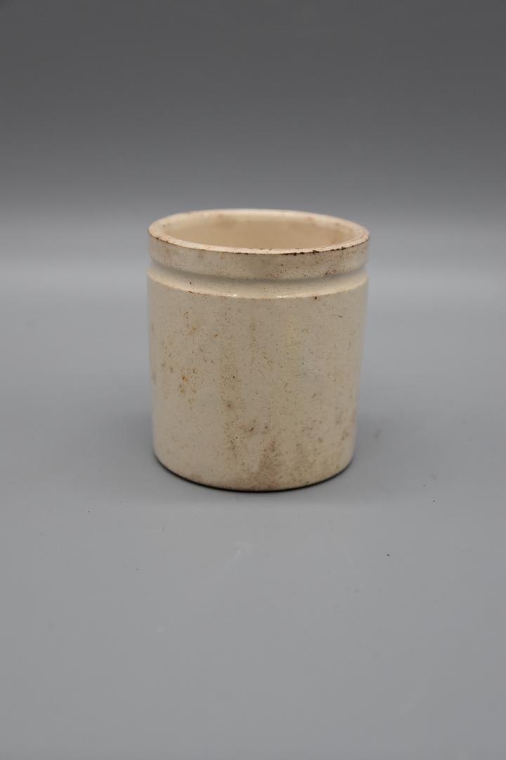 "de": "Eine runde cremefarbene Salbendose die ein eingetieftes Profil unter dem geraden Rand besitzt. Am Boden sieht man Rillen."