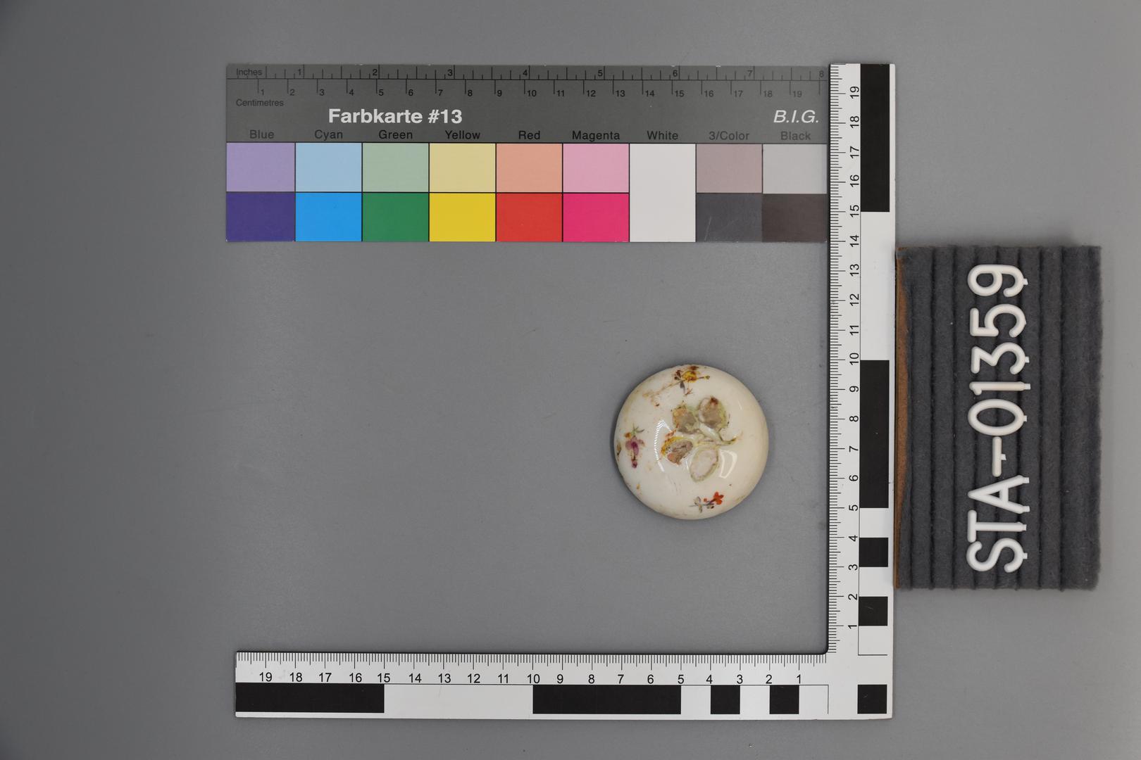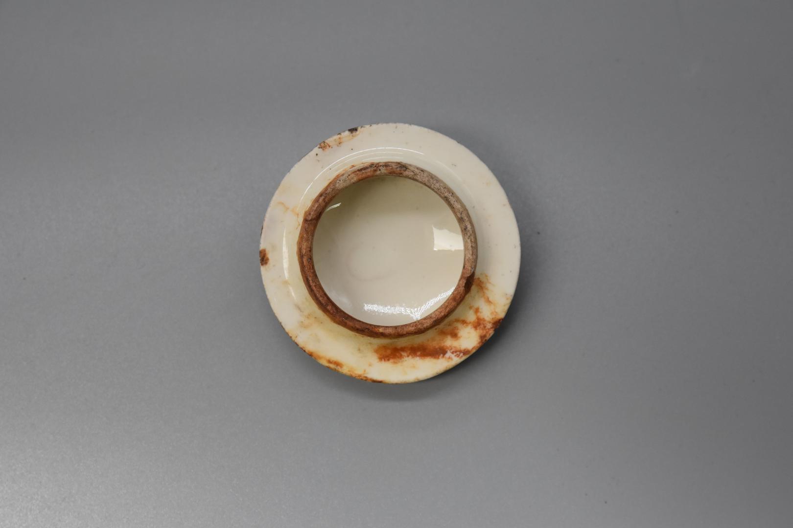 Der runde Porzellandeckel ist weiß und besitzt keinen Knauf. An den Seiten der Oberfläche sind Blumenmotive aufgemalt und ein weiteres Blumenmotiv oben auf dem Deckel in der Mitte ist ausgebrochen und man sieht nur mehr die Umrisse der Pflanze.