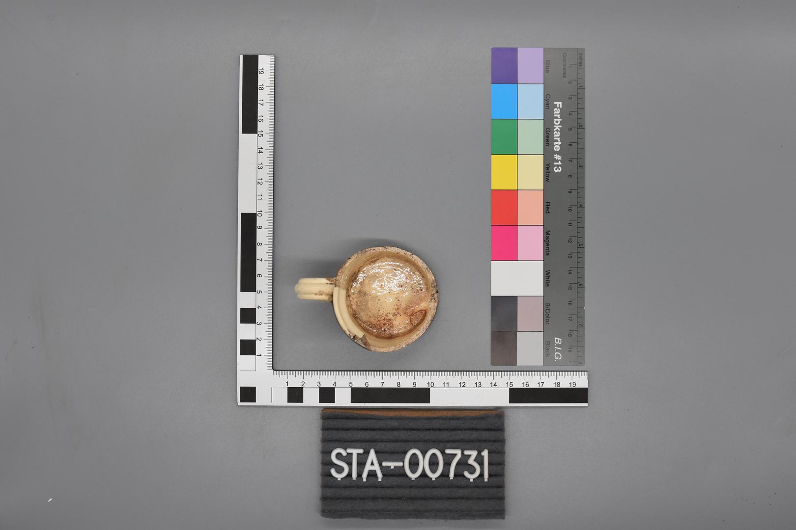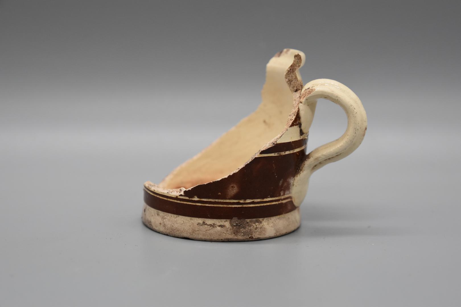 Die kleine Tasse aus Steingut ist glasiert mit einer beigeweißen Grundglasur und einem mittelbraunen Liniendekor. Außen ist vertikal ein profilierter Henkel angebracht.