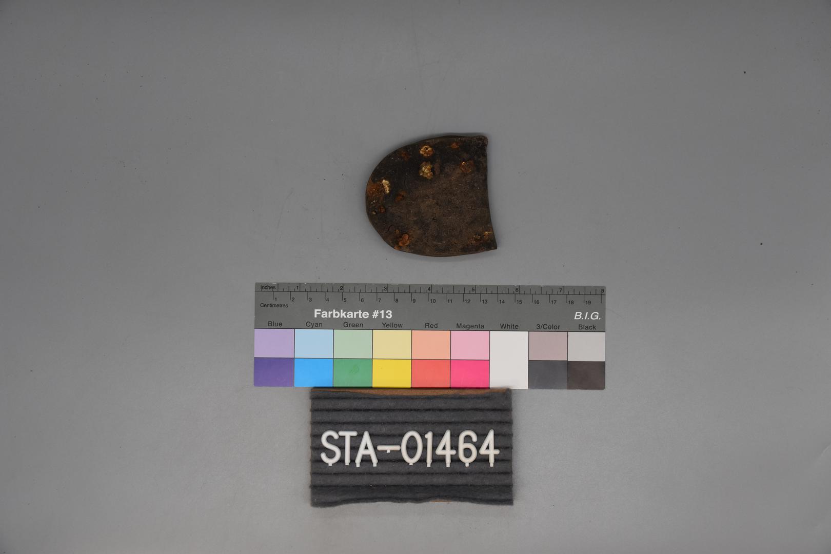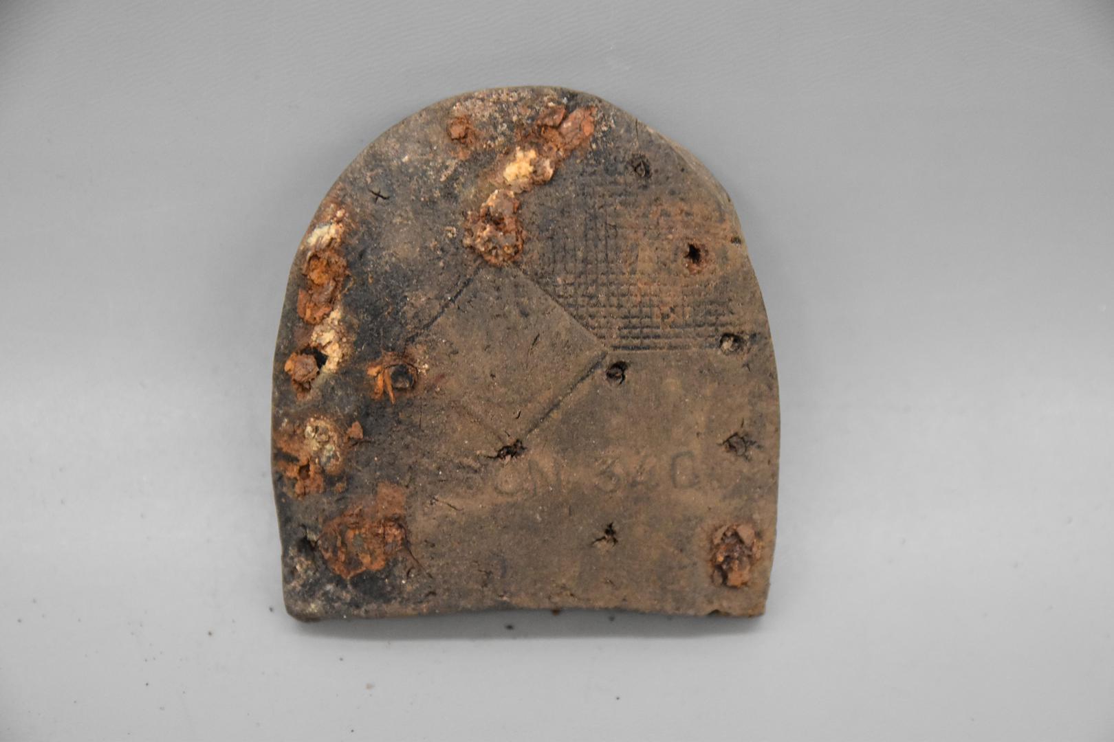 "de": "Der dunkelgraue Schuhabsatz ist hufeisenförmig und die gerade Seite ist leicht gebogen. Im Absatz befinden sich Löcher, in denen noch Nägel stecken. In der Mitte der Unterseite befindet sich eine rautenförmige Vertiefung, darüber ist die Sohle bis zur Mitte profiliert und darunter glatt."
