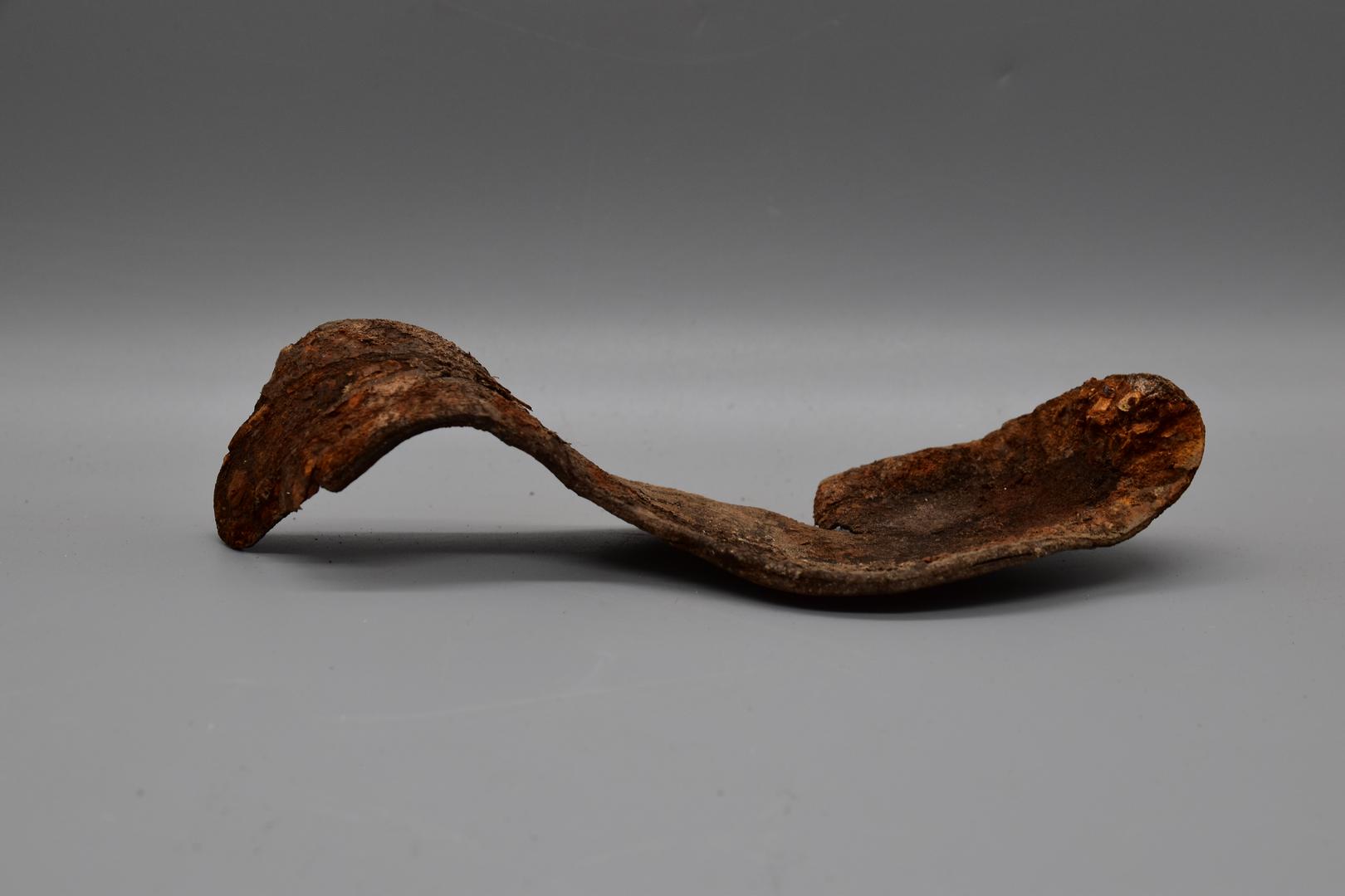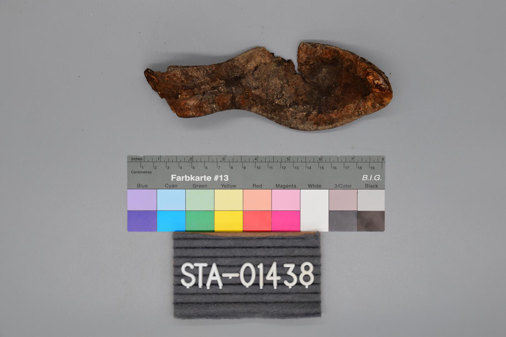 "de": "Eine dunkelbraune Schuhsohle, die vorne etwas breiter und nach hinten schmal geschnitten ist. Es sind noch Nietenreste am Rand entlang erhalten. Es handelt sich dabei vermutlich um die Schuhsohle eines Damenschuhs. Die Sohle ist verbogen in einer \"s\"-Form."
