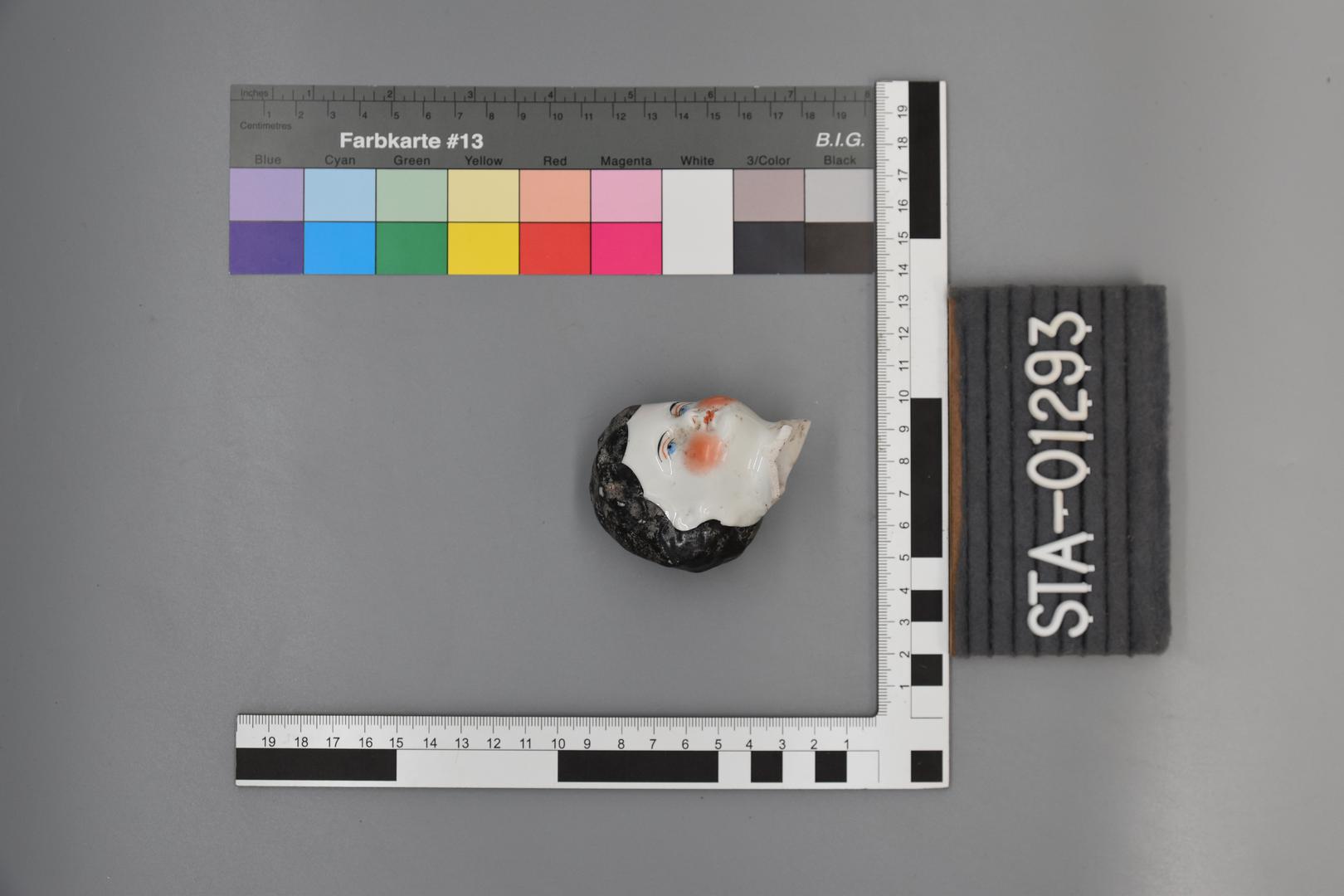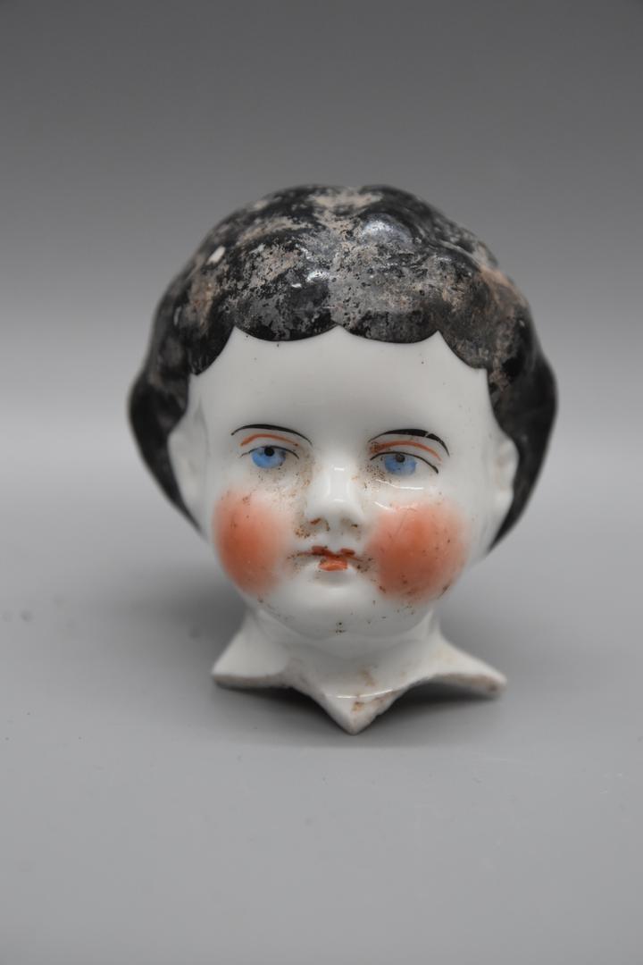 Der Puppenkopf aus Porzellan ist glasiert und das Gesicht als auch die Frisur sind plastisch dargestellt. Die Haare sind in einem dunkelbraun, die Augenbrauen schwarz, die Augen blau und Wangen und Lippen sind rot bemalt. Der Kopf ist innen hohl.