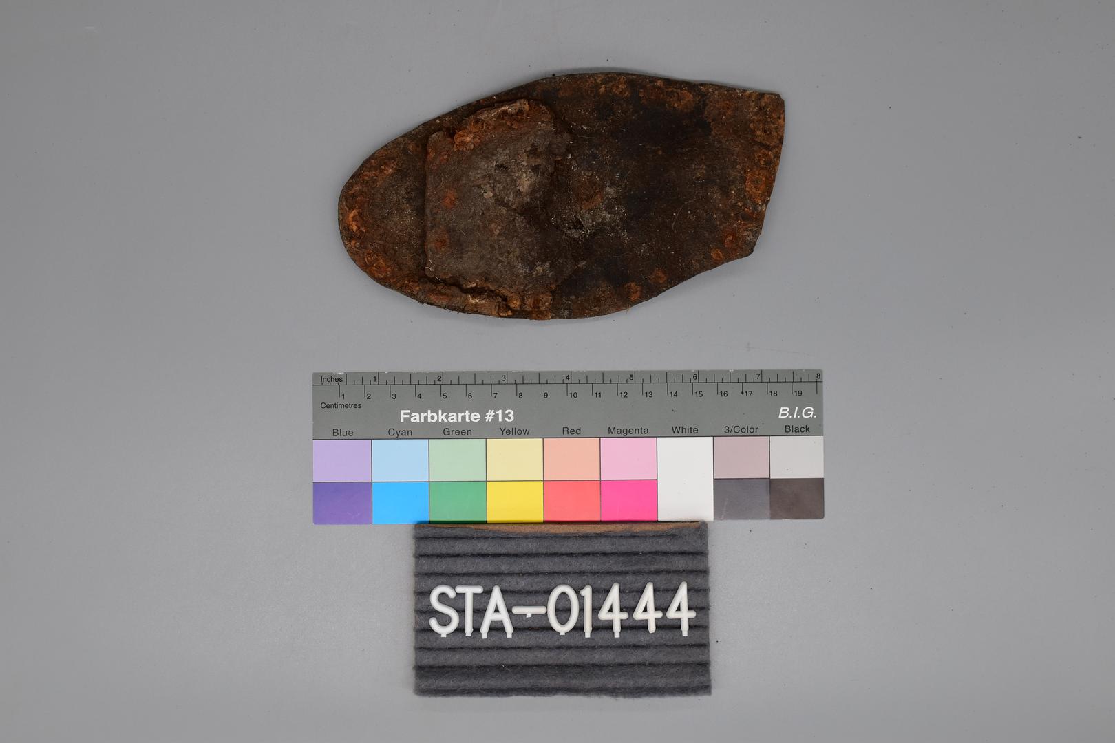 "de": "Eine dunkelbraune Schuhsohle aus Gummi, Leder und Metall. Die Sohle ist an der Unterseite profiliert. Die Innensohle ist teilweise erhalten und Nägel sind ebenfalls erhalten."