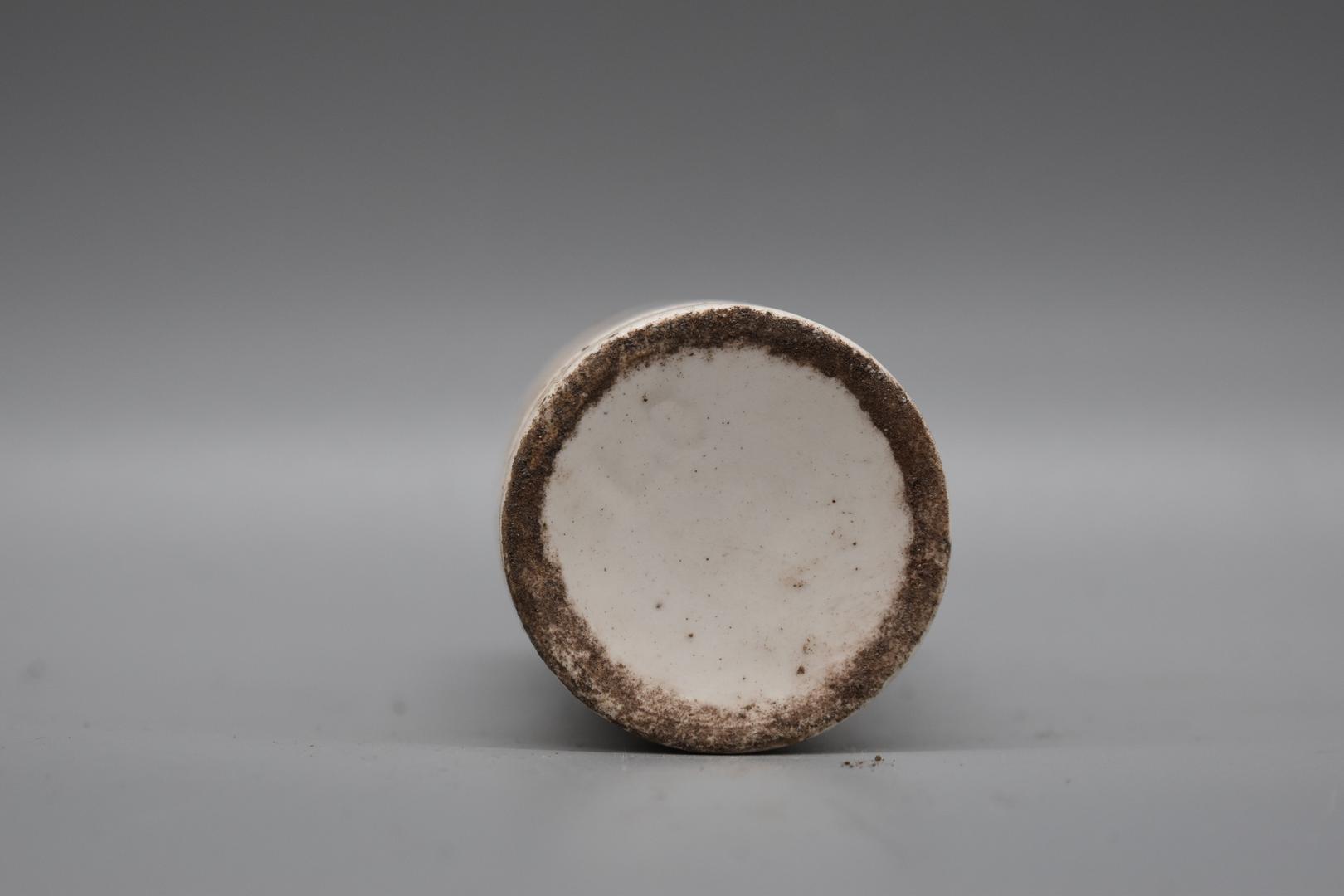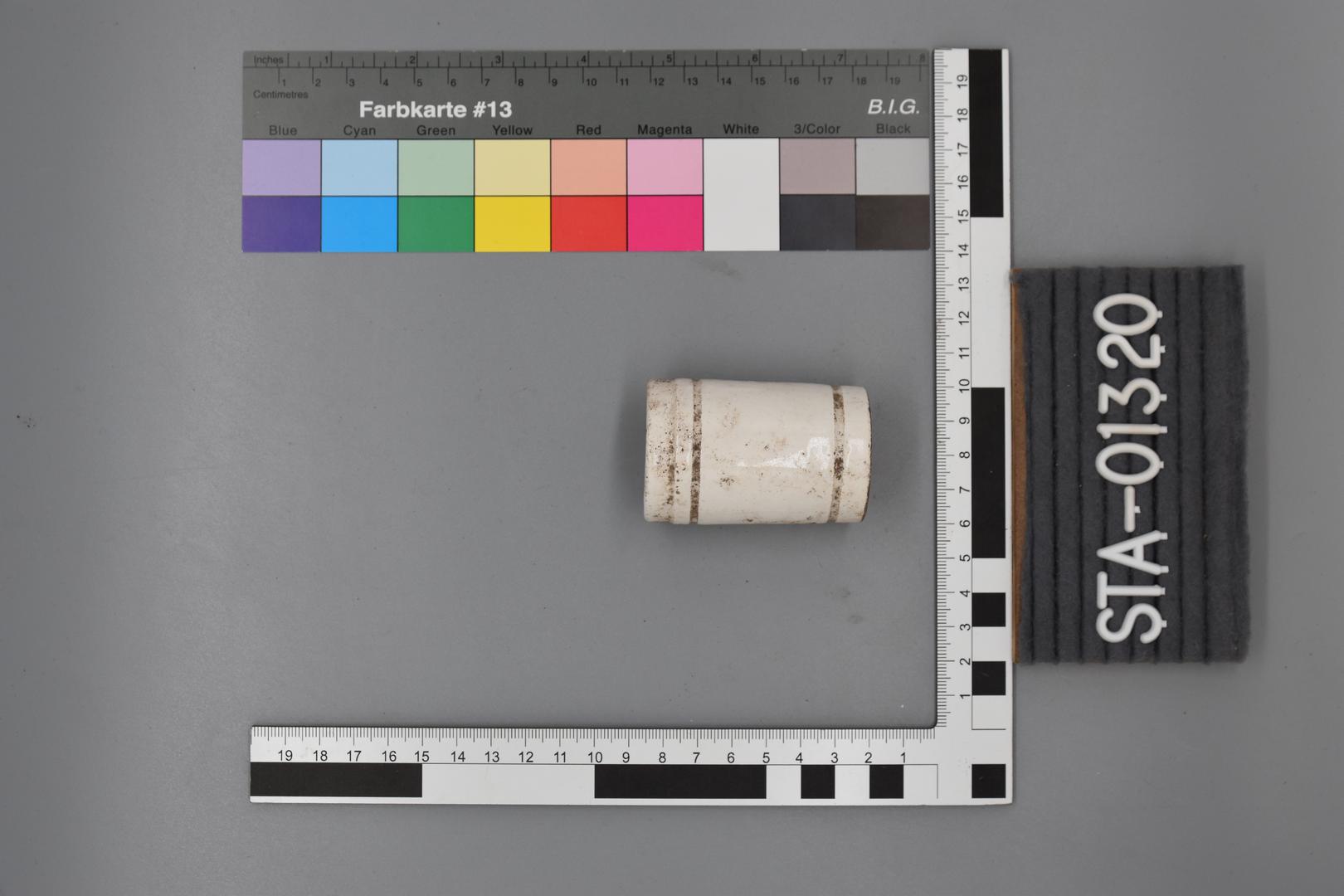 "de": "Die weiße Salbendose ist zylindrisch geformt. Der Hals ist von der Schulter abgesetzt und das Gefäß ist geradlinig. Am Körper verläuft oben und weiter unten jeweils eine horizontale und leicht eingetiefte Linie."