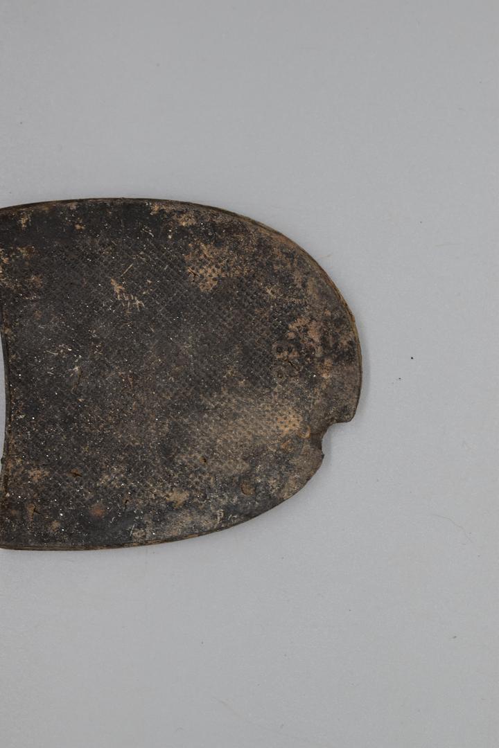 "de": "Ein dunkelbrauner Schuhabsatz aus Gummi. Der Absatz ist mit drei Kreisen auf der kurzen Seite und einem Kreis auf der langen Seite erhalten. Die Nägel, die nicht mehr vorhanden sind, wurden durch die Kreise gesteckt. Er weist feine lineare Rillen auf, die von der Mitte nach außen verlaufen. Die Oberseite hat eine gerippte Oberfläche."