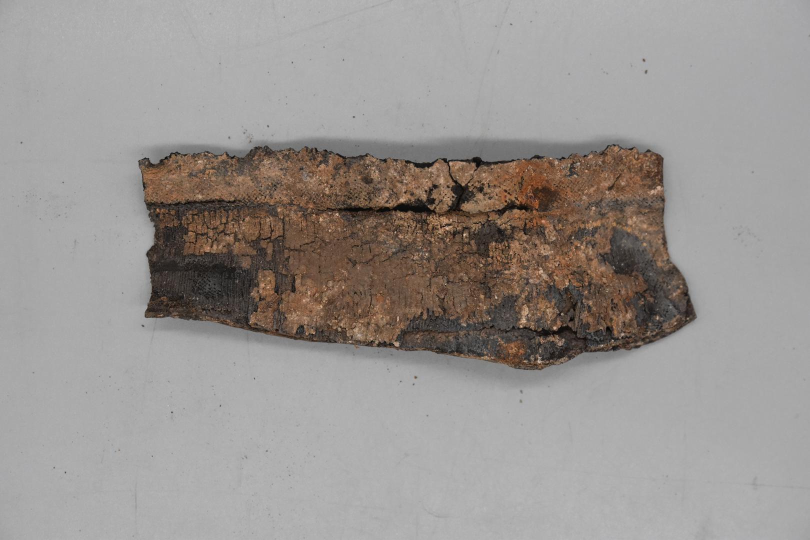 Ein länglich rechteckiges Fragment eines schwarzen Motorradreifens. Der Reifen ist auf einer Seite vertieft und dicker. Die Innenseite ist texturiert.