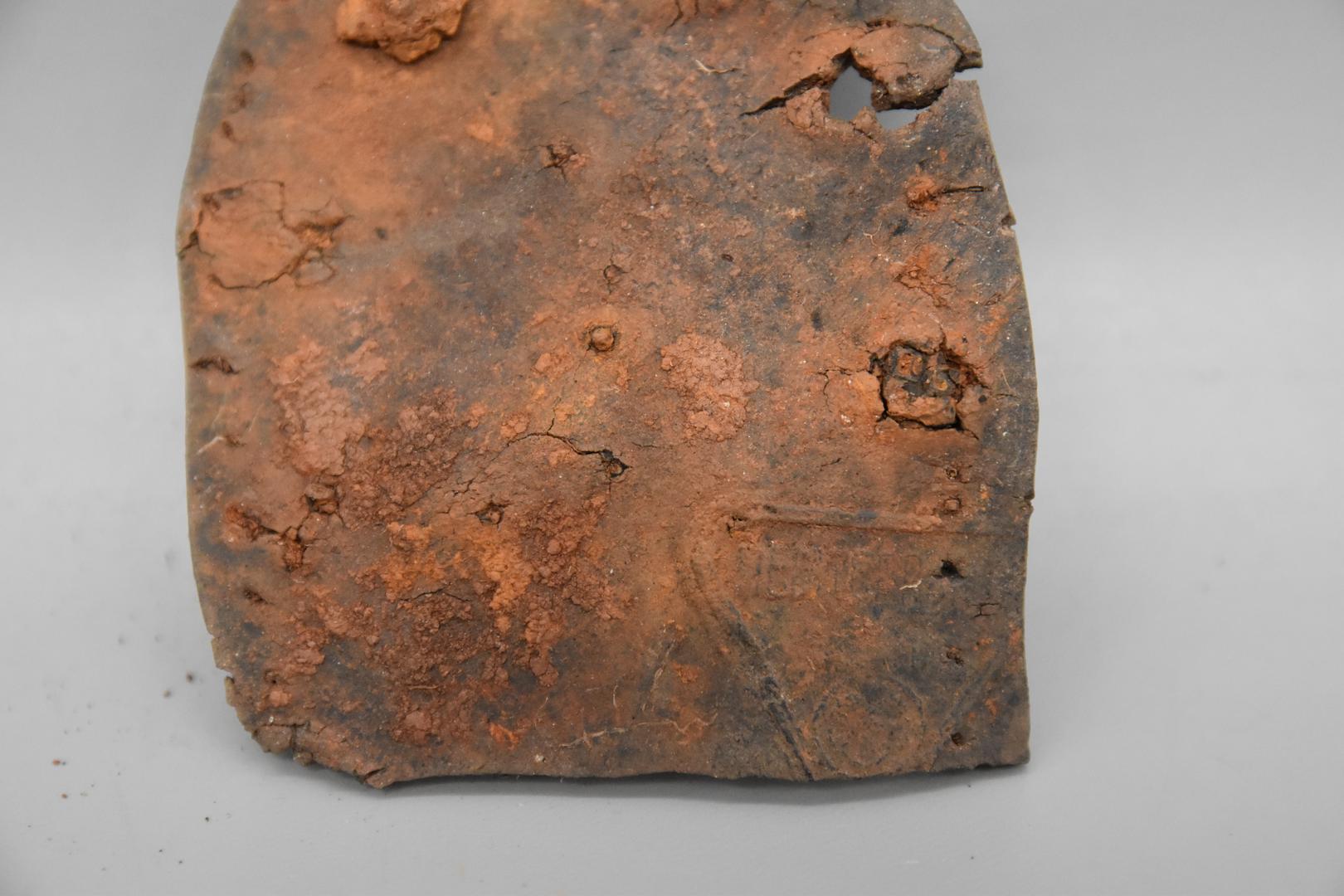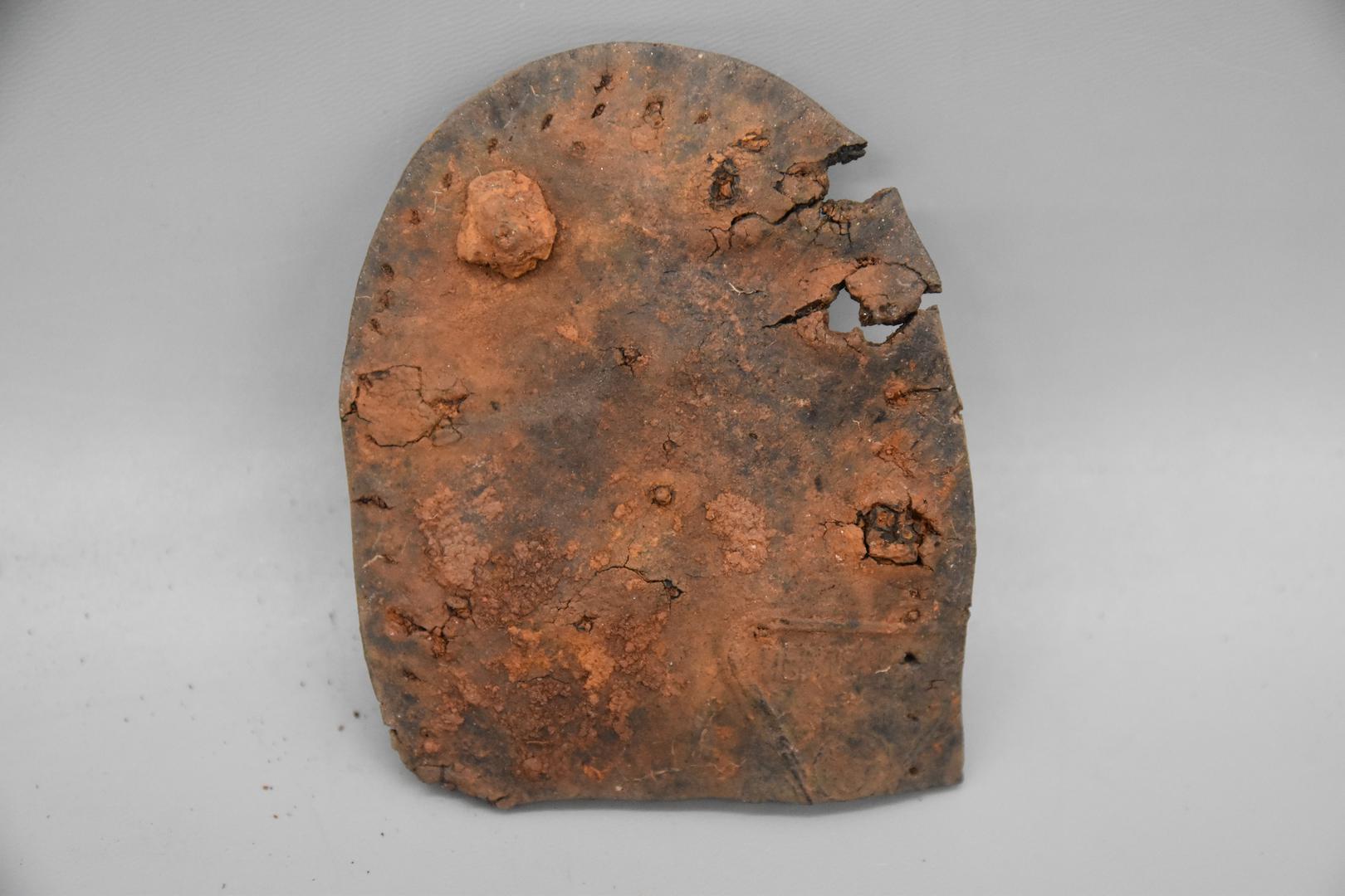 "de": "Der dunkelgraue Schuhabsatz ist hufeisenförmig mit einer geraden Seite. Im Absatz befinden sich Löcher, in denen noch Nägel stecken. Eine Seite ist stark profiliert. Die glatte Seite besitzt ein eingeprägtes Dreieck."