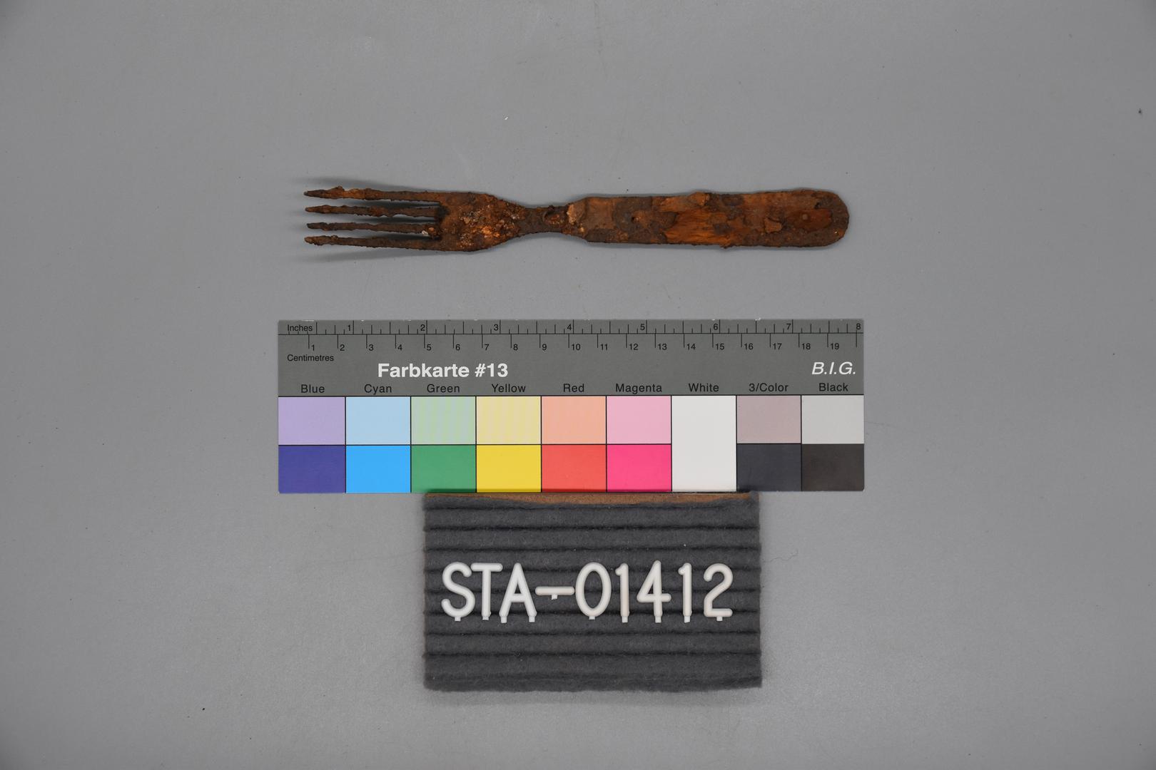 Die Gabel besitzt einen Nagel und hatte einen Holzgriff, da noch Reste davon sich auf dem Griffbereich befinden. Die Gabelzähne sind sehr lang und rechteckig.