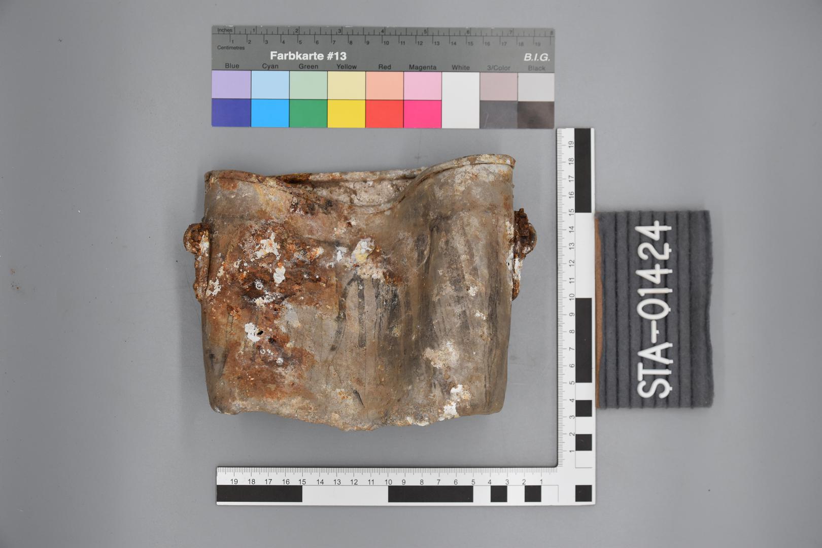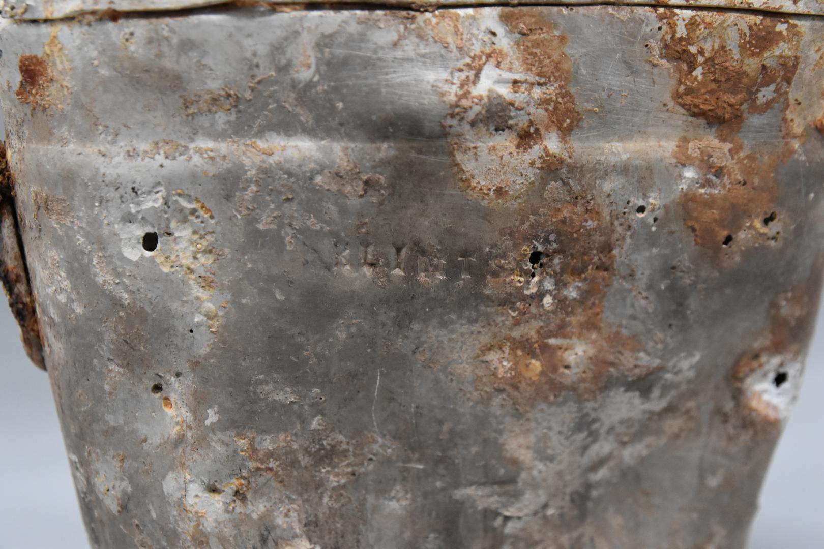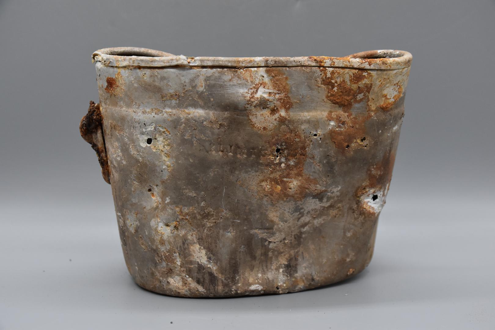Der nierenförmige Topf einer Gamelle hat Henkelbefestigungsreste. Der Topf hat schwarze Tropflinien auf der Außenseite.