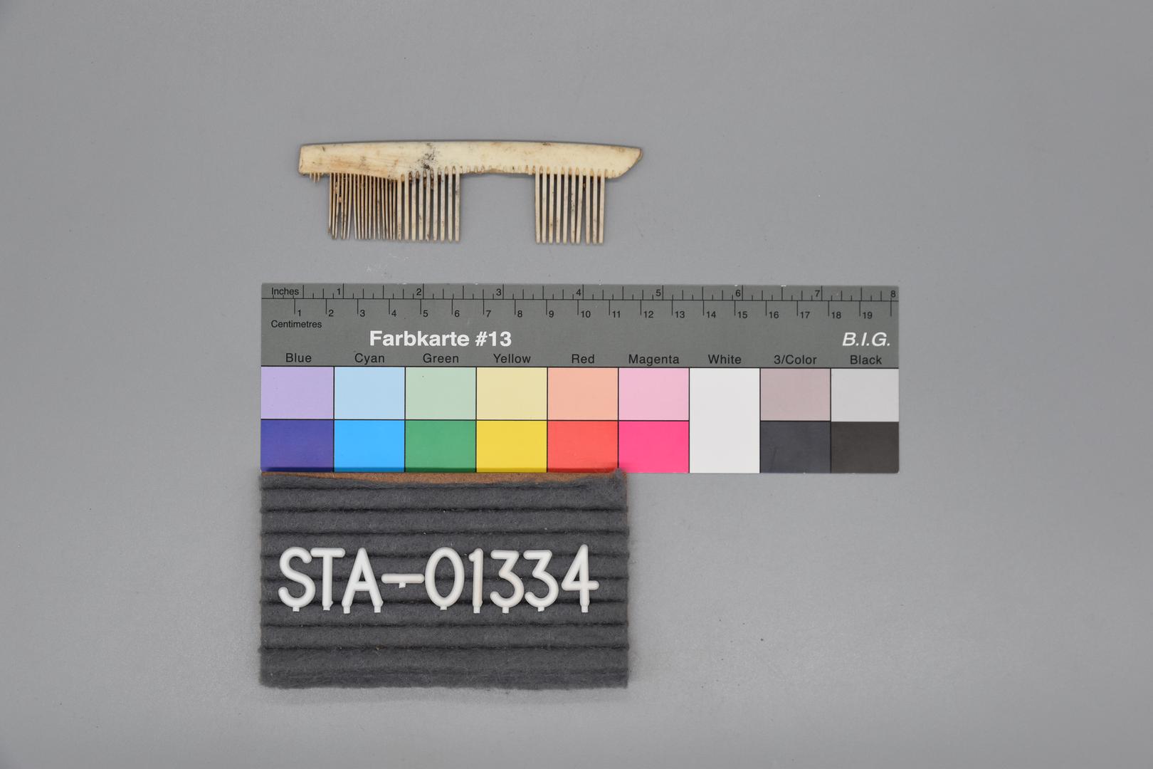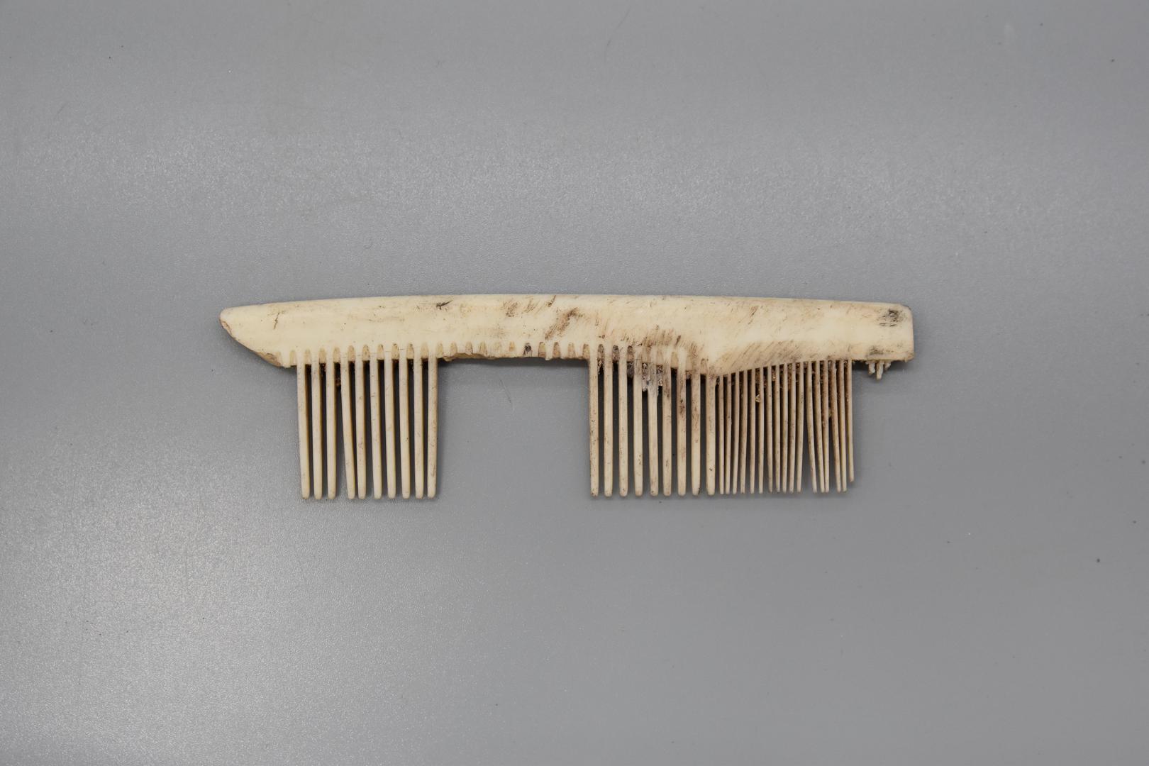 Der Kamm ist beige und rechteckig. Die Griffkanten sind abgerundet. Der Kamm ist nicht vollständig erhalten und ein paar Kammzähne fehlen.