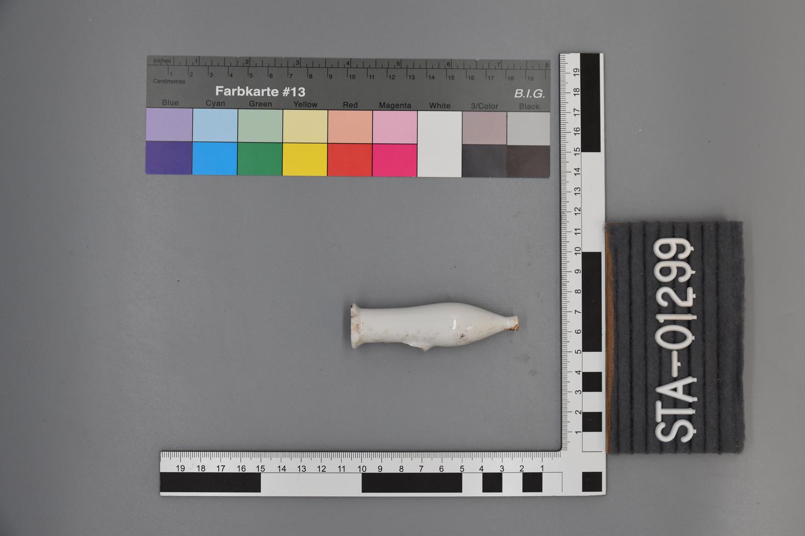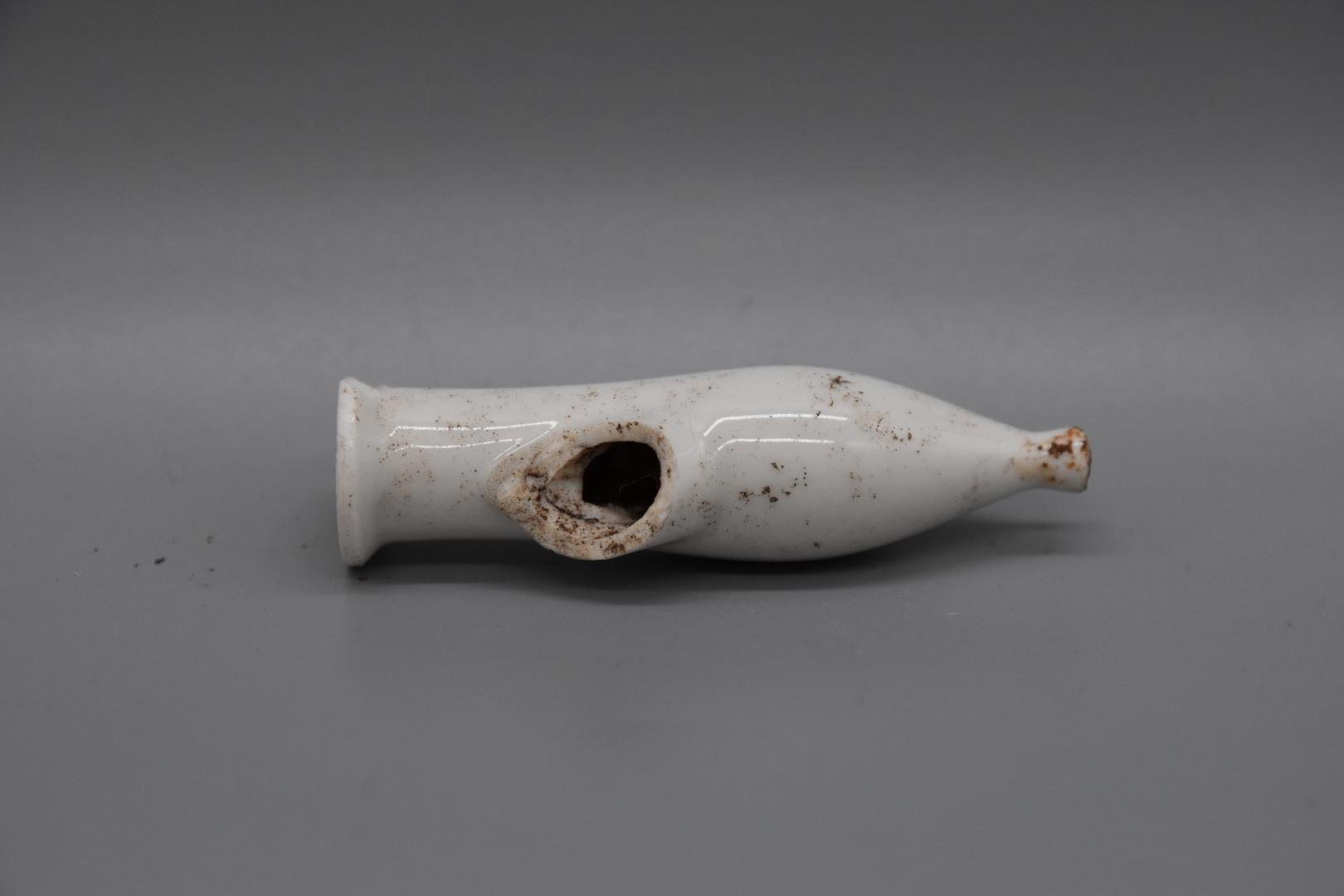 Die Pfeife ist weiß glasiert und besitzt eine konische Form und weitet sich nach unten. Der Abschluss der Pfeife ist leicht abgeflacht. Der Rand ist gerade und der Hals ist nach oben hin ausladend.
