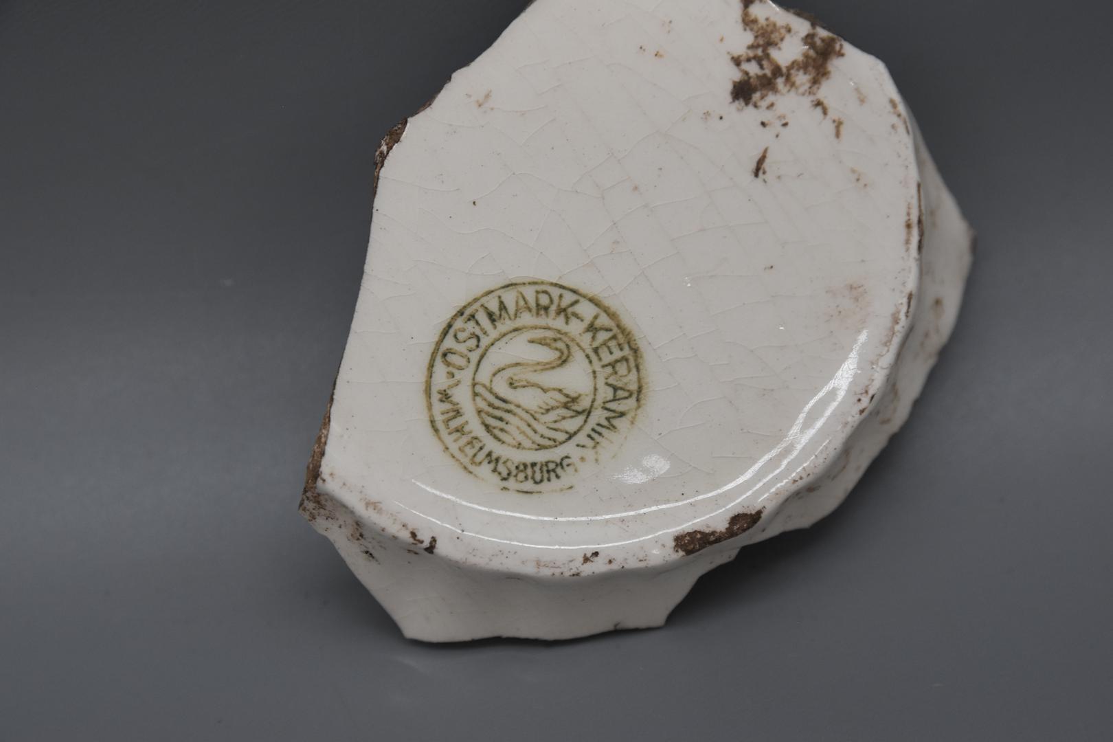 "de": "Stempel: \"OSTMARK ∙ KERAMIK ∙ WILHELMSBURG\" (im äußeren Kreis umlaufend), Schwan im Wasser (im inneren Kreis), (Boden)"
