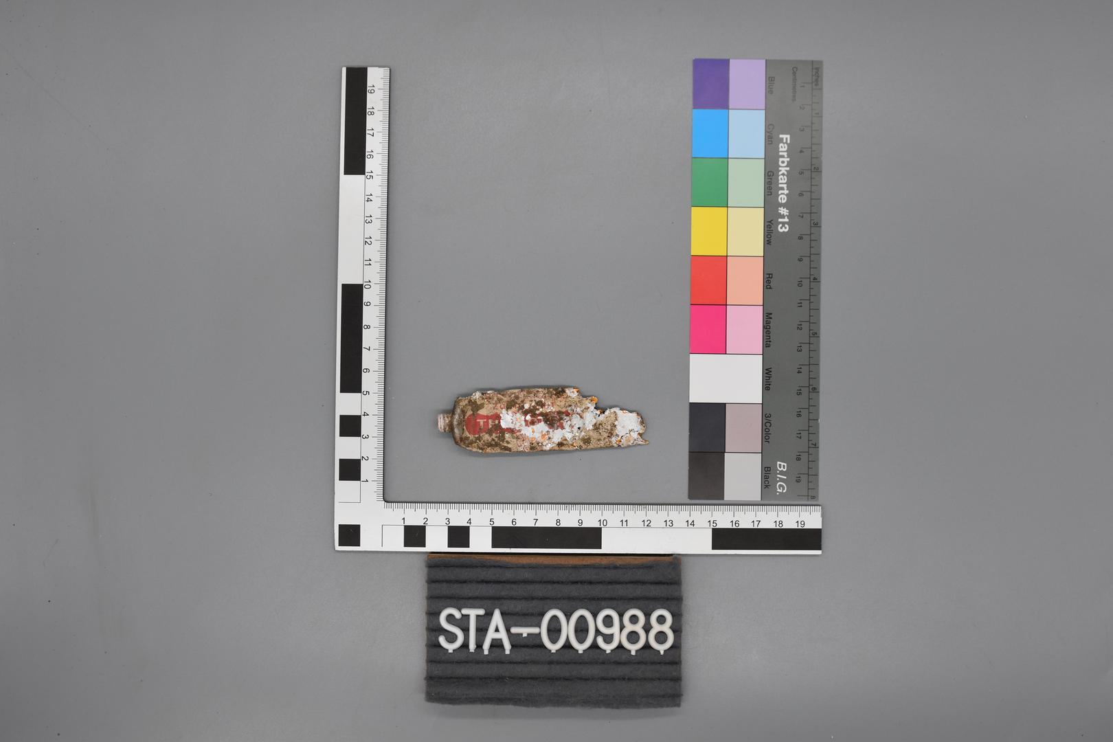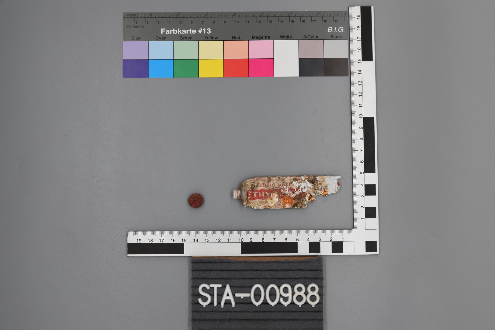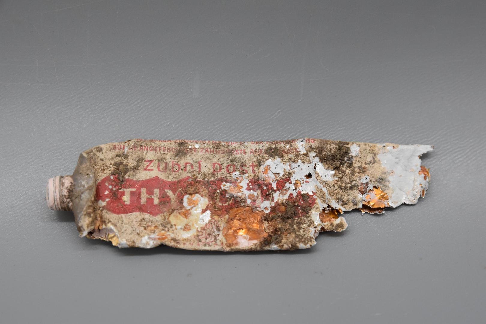 "de": "Die Zahnpastatube in roter und weißer Farbe in länglicher Form ist ausgedrückt und stark verblichen. Auf einer Seite der Tube steht \"Zubri Pasta\", \"THY[...]\" und \"auf die angefeuchtete Zahnbürste auftragen [...]\". Als Verschluss dient ein Schraubgewinde. Die Kappe ist separat und wurde nicht gescannt."