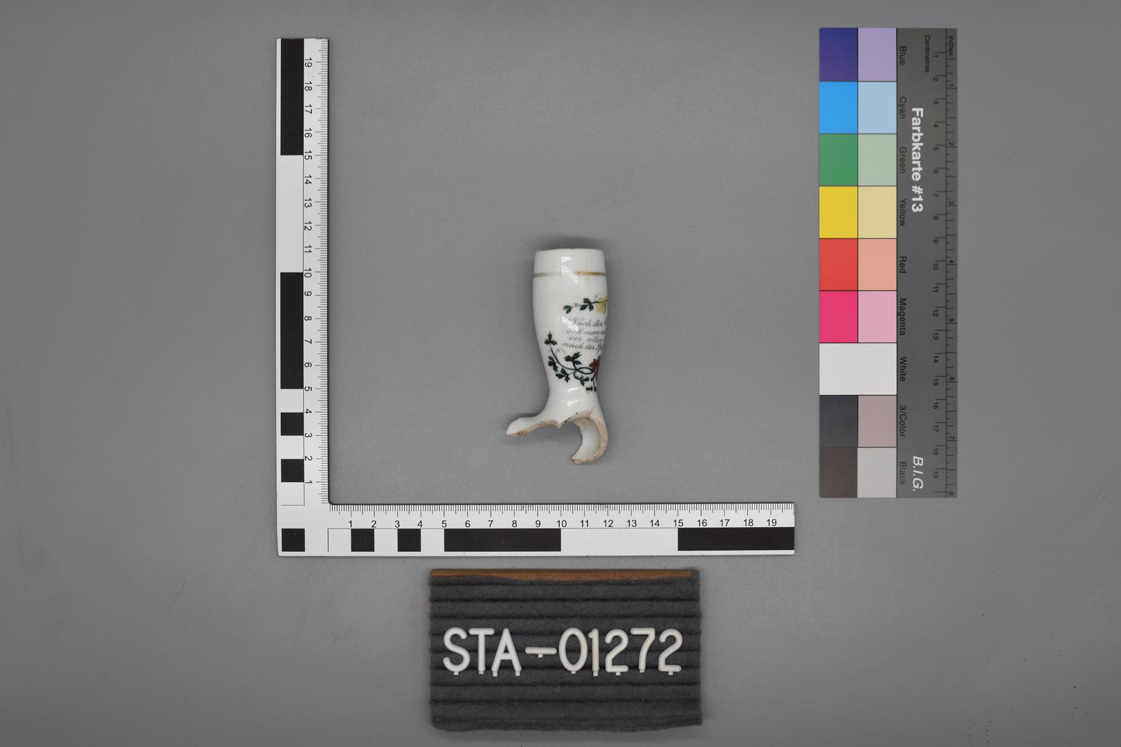 - An der oberen Öffnung befindet sich ein goldener Rand. Das Mundstück ist weggebrochen.