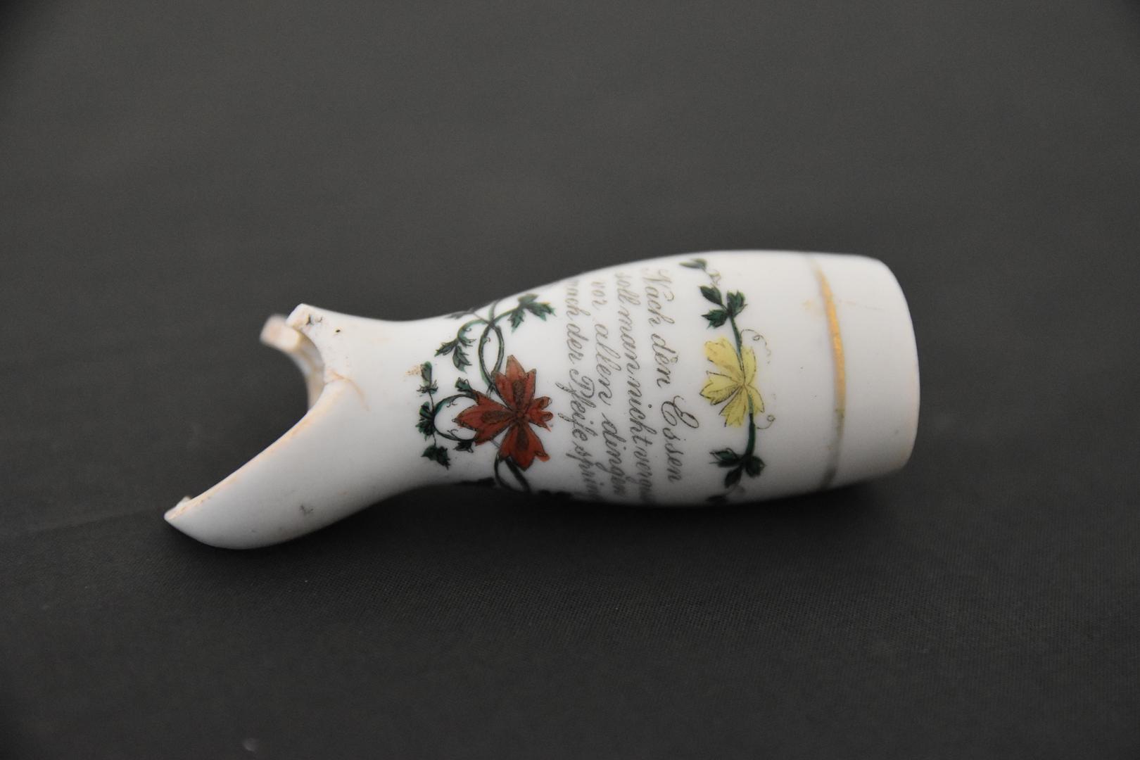 Es handelt sich um eine weiße Porzellanpfeife mit Textmotiv. Der Text lautet "Nach den Essen soll man nicht vergessen, vor allen dingen nach der Pfeife springen." Im Ober- und Unterbereich des Textes sind Ranken dargestellt und mittig befinden sich gelbe und rote Blüten.