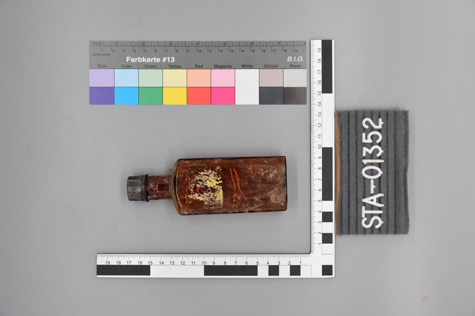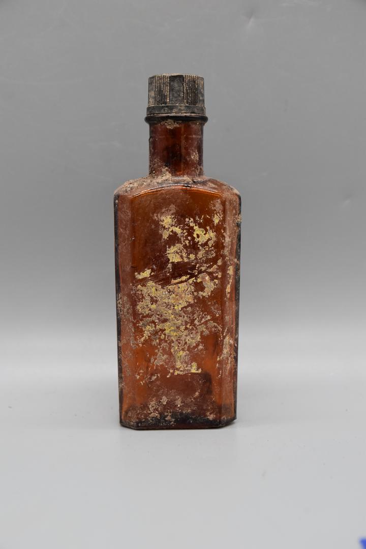 Die braune Glasflasche hat einen langen zylindrischen Hals, stark abgesetzte Schultern und der Körper ist achteckig geformt. Es sind noch Reste von einem Etikett sichtbar. Die Flasche besitzt eine schwarze Verschlusskappe.