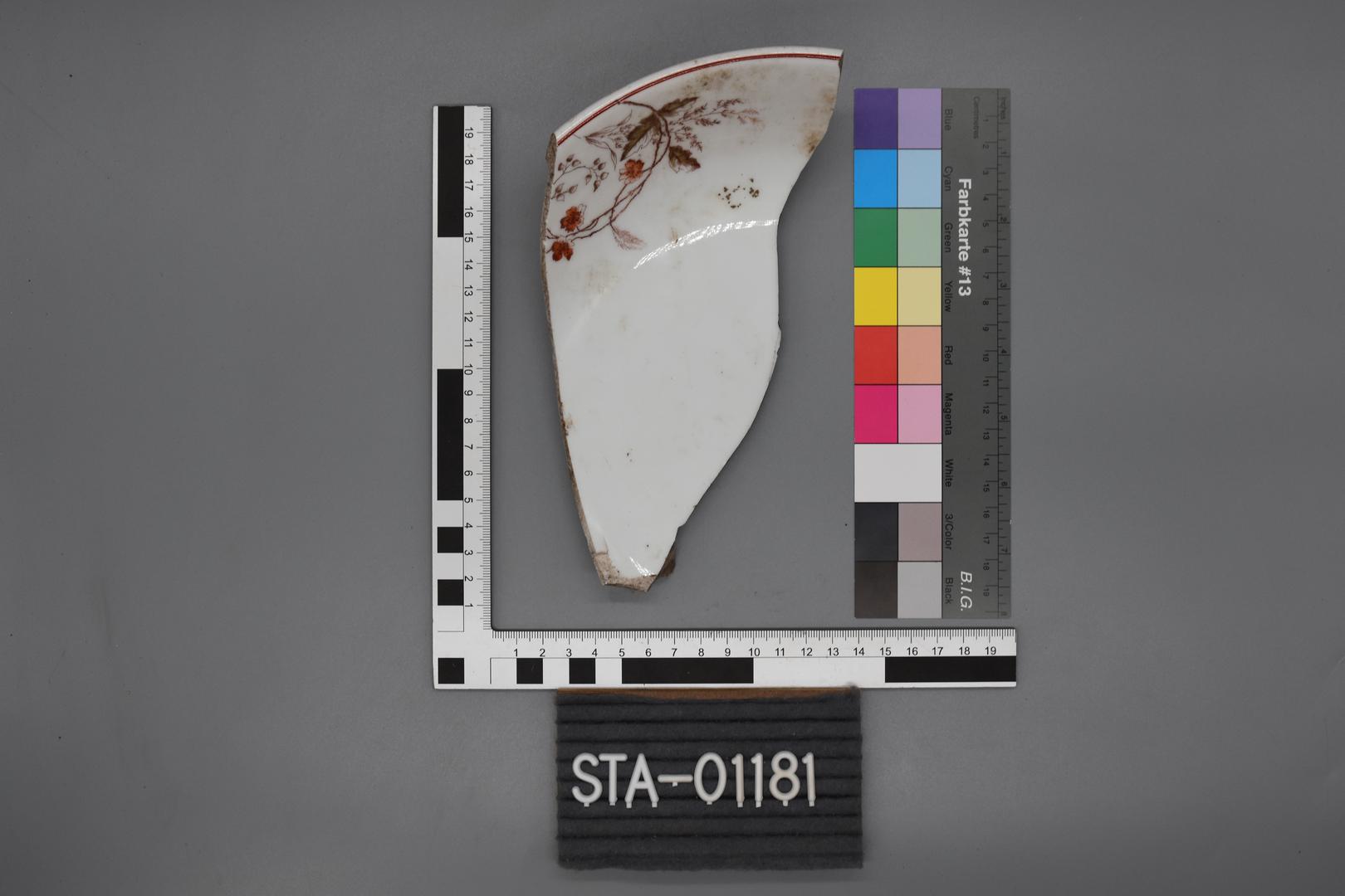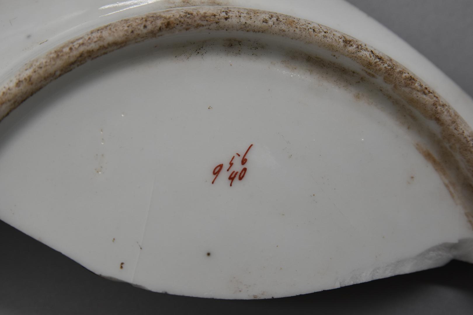 "de": "Ein Fragment einer weißen Porzellanschüssel ist im Inneren mit einem Linien- und Floraldekor ausgestattet. Am Randabschluss ist eine umlaufende dunkelrote Linie. Der Rand ist hochgezogen und verstärkt. Die Mulde ist eingetieft und am Boden ist ein Standring. Am Boden befindet sich mittig eine dunkelrote Beschriftung mit \"956\" und \"40\"."