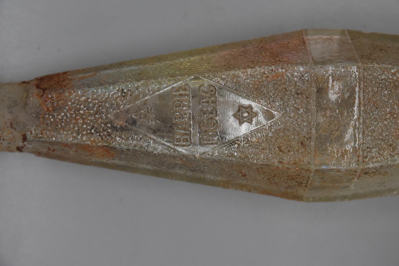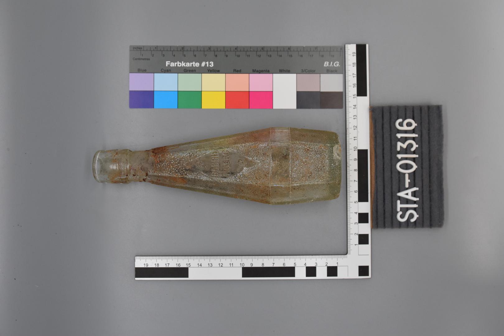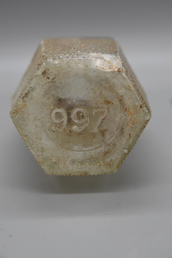Die transparente, sechskantige Flasche besitzt ein verdicktes Mundstück mit Durchlochungen für einen Verschluss, einen geraden Hals und einen fein genoppten, sich geradlinig weitenden und verjüngenden Körper der in der Mitte von einem glatten Band unterbrochen wird. Der Boden wölbt sich leicht nach oben. Eine glatte Raute umrahmt die Kennzeichnung.