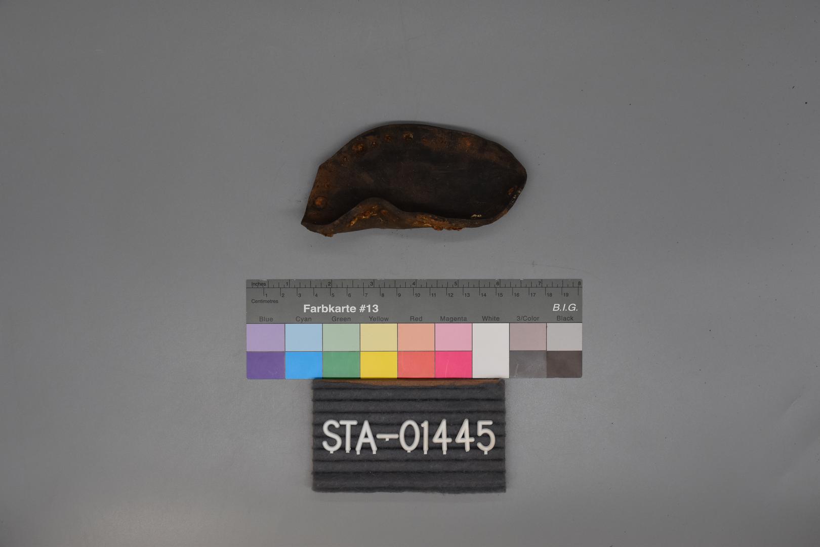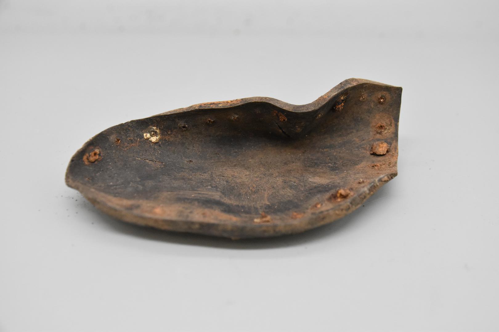 "de": "Eine dunkelbraune Gummisohle. Der vordere Teil der Sohle ist erhalten und sie ist glatt. Einige Nägel sind erhalten und die Sohle ist deformiert."
