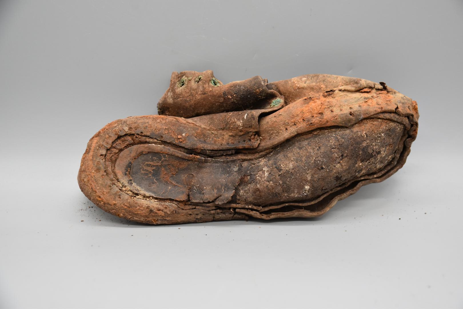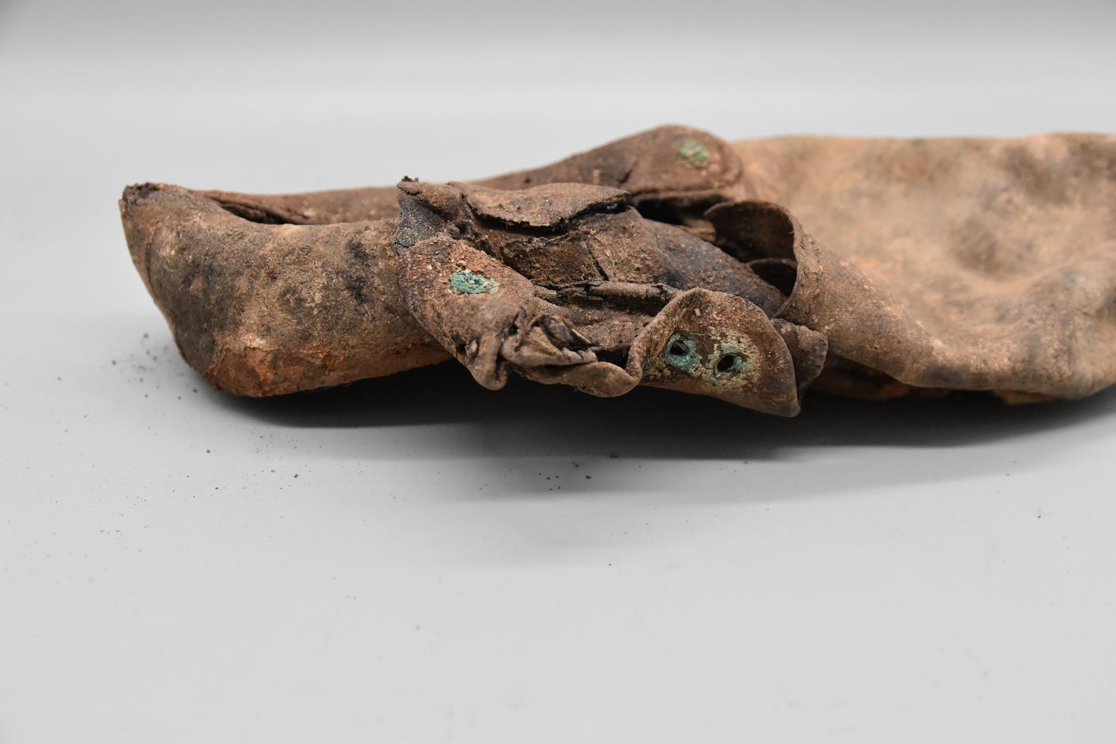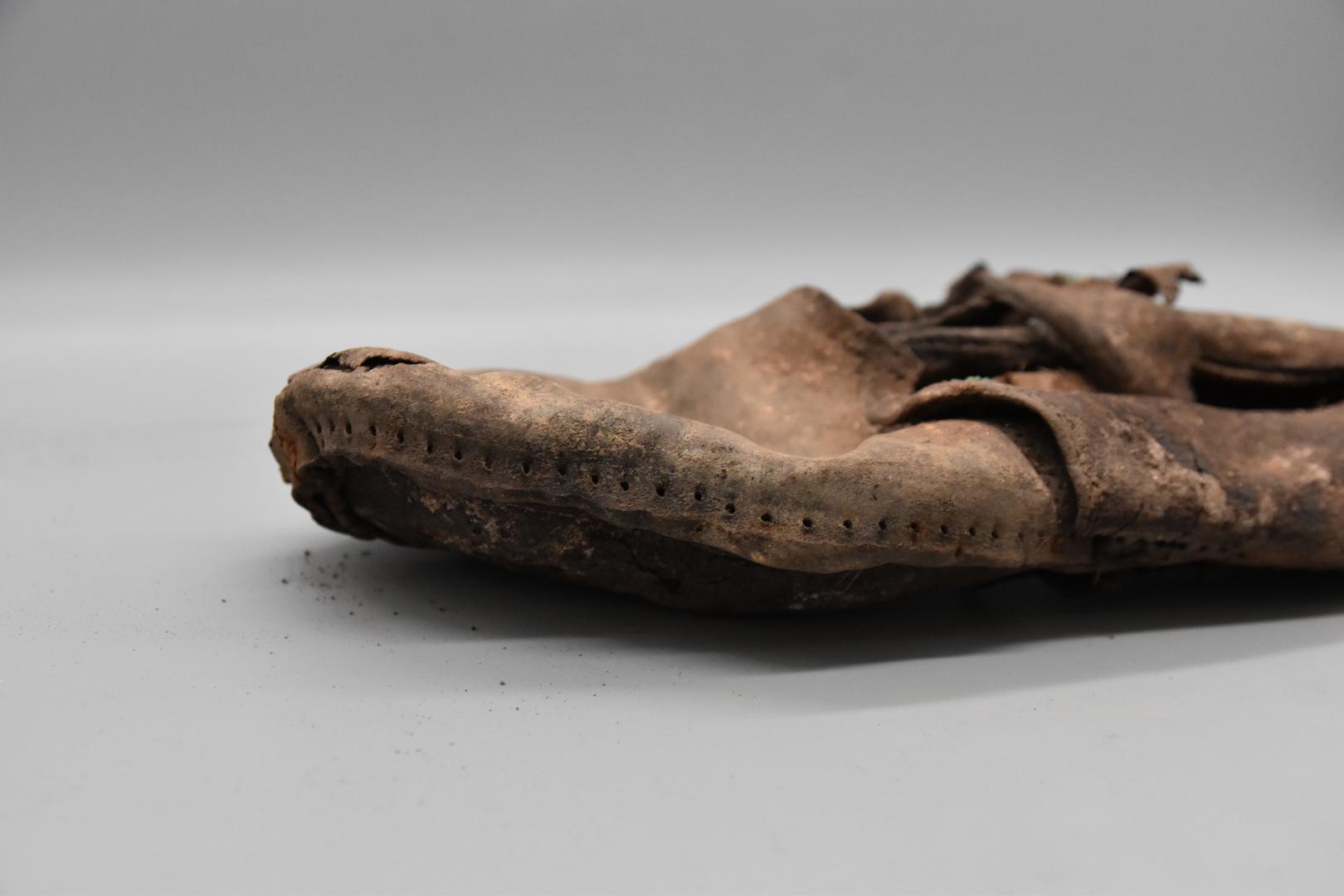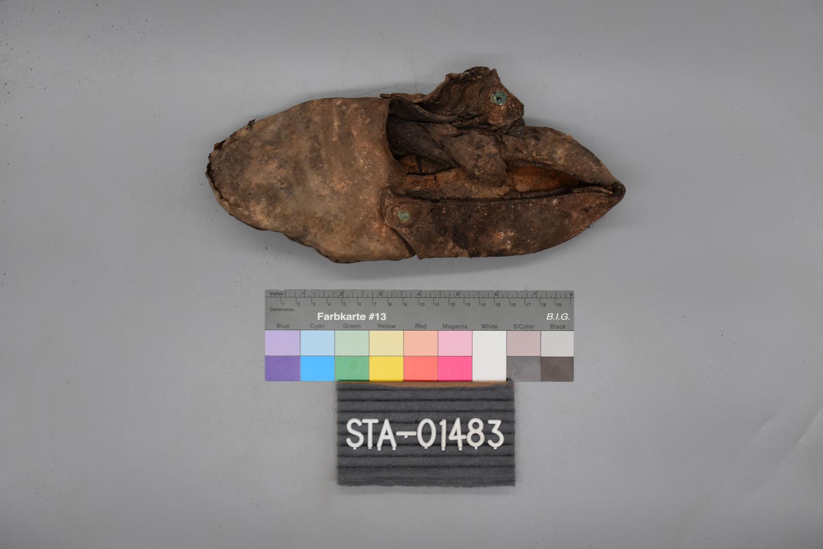 Ein brauner Halbschuh aus Leder. Der Schuh ist zum Schnüren und besitzt noch die Ösen. Um unteren Rand sind Durchlochungen sichtbar. Die Sohle ist nicht mehr vollständig erhalten.