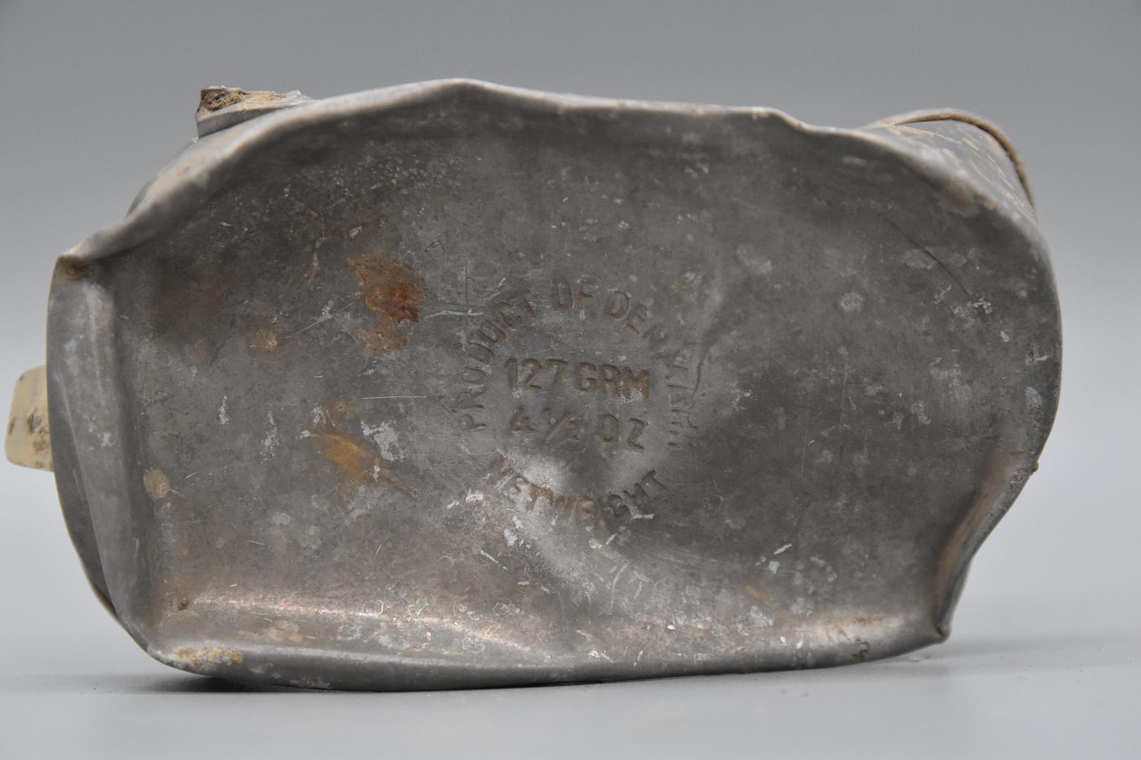 Kennzeichnung: "PRODUCT OF DENMARK", "127 GRM", "4 1/2 OZ NETWEIGHT" (Boden)