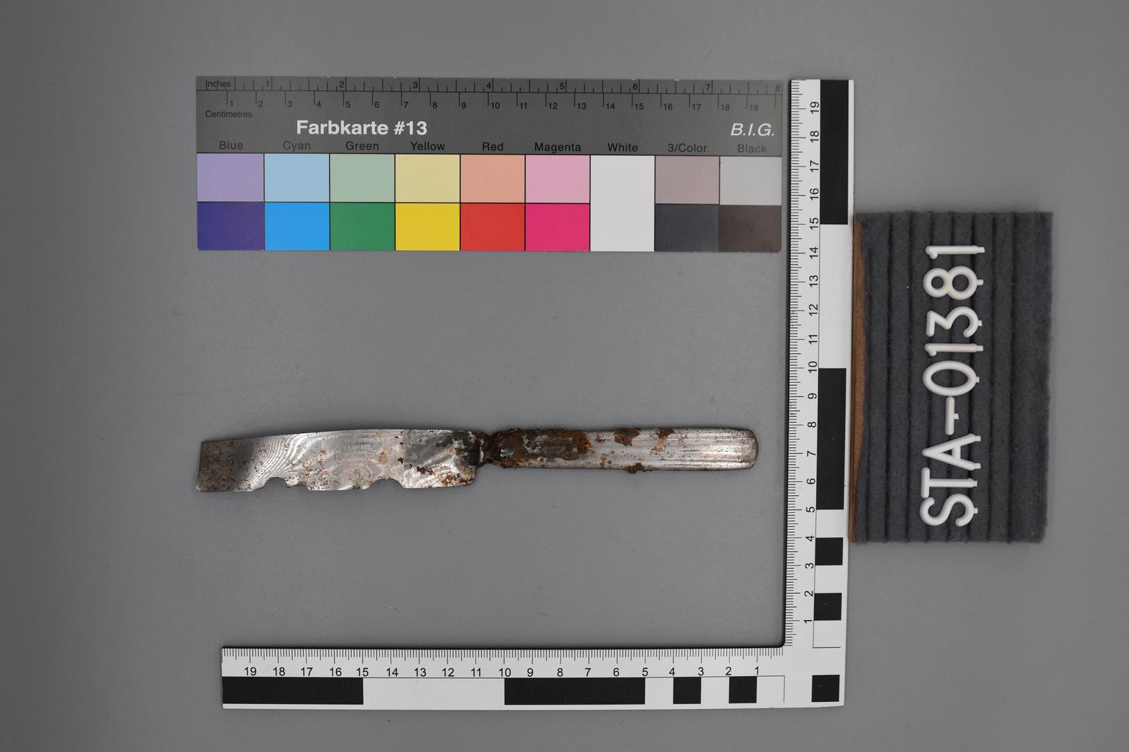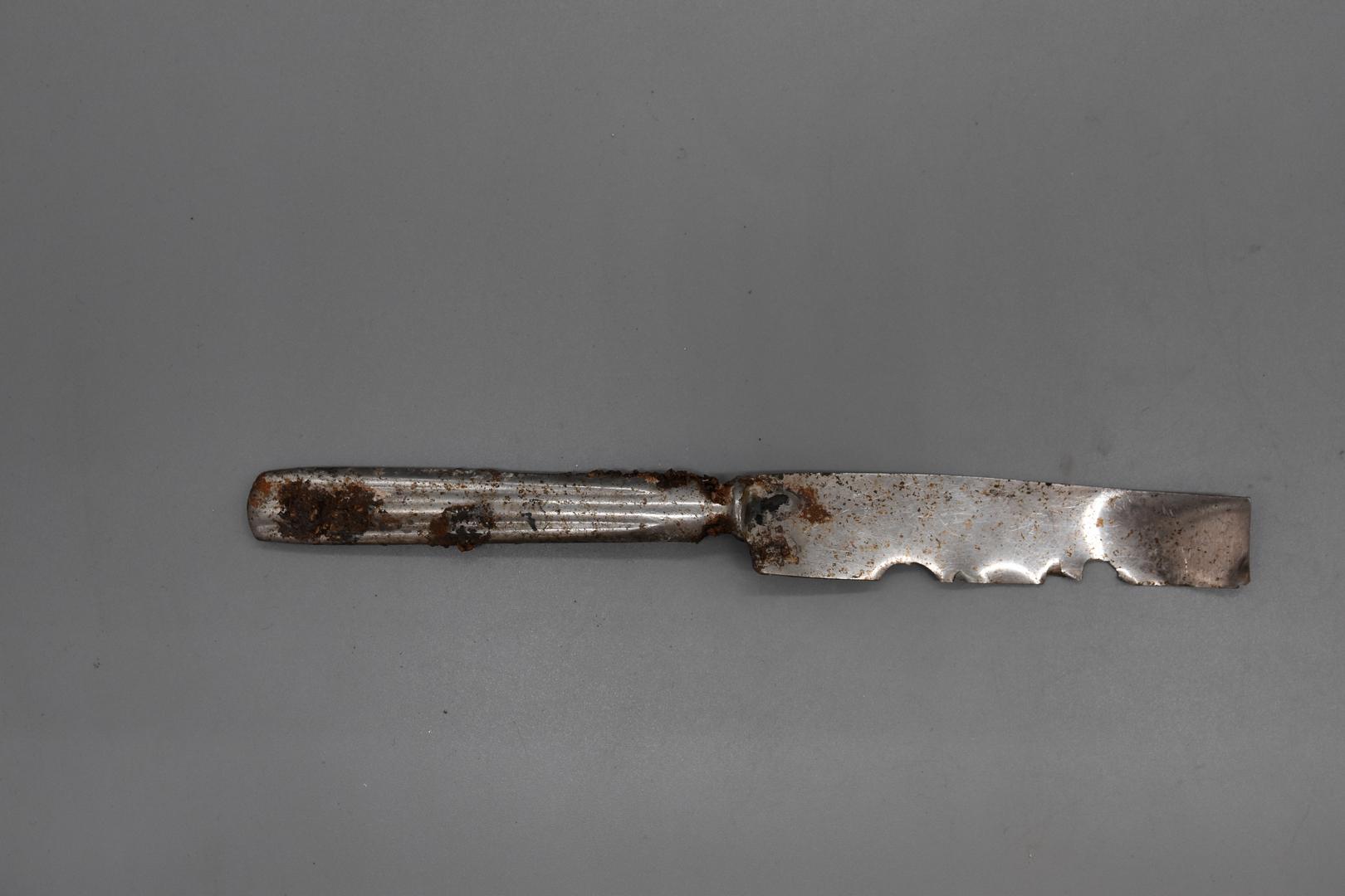 Das Messer ist länglich rechteckig. Der Griff ist rechteckig geformt, am Ende leicht abgerundet und die Spitze des Messer ist abgebrochen. In der Schneide sind halbrundförmige Aussparungen.