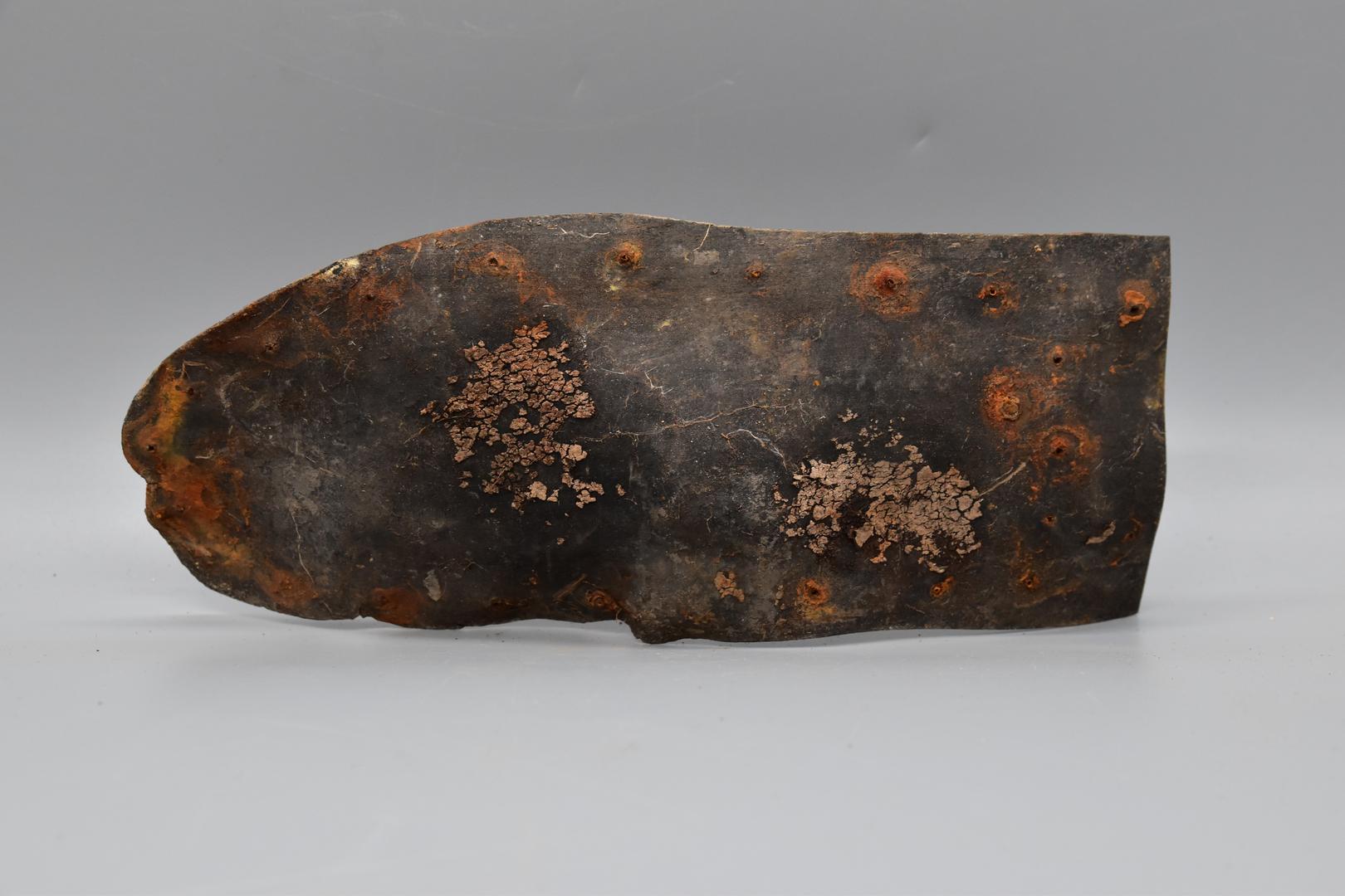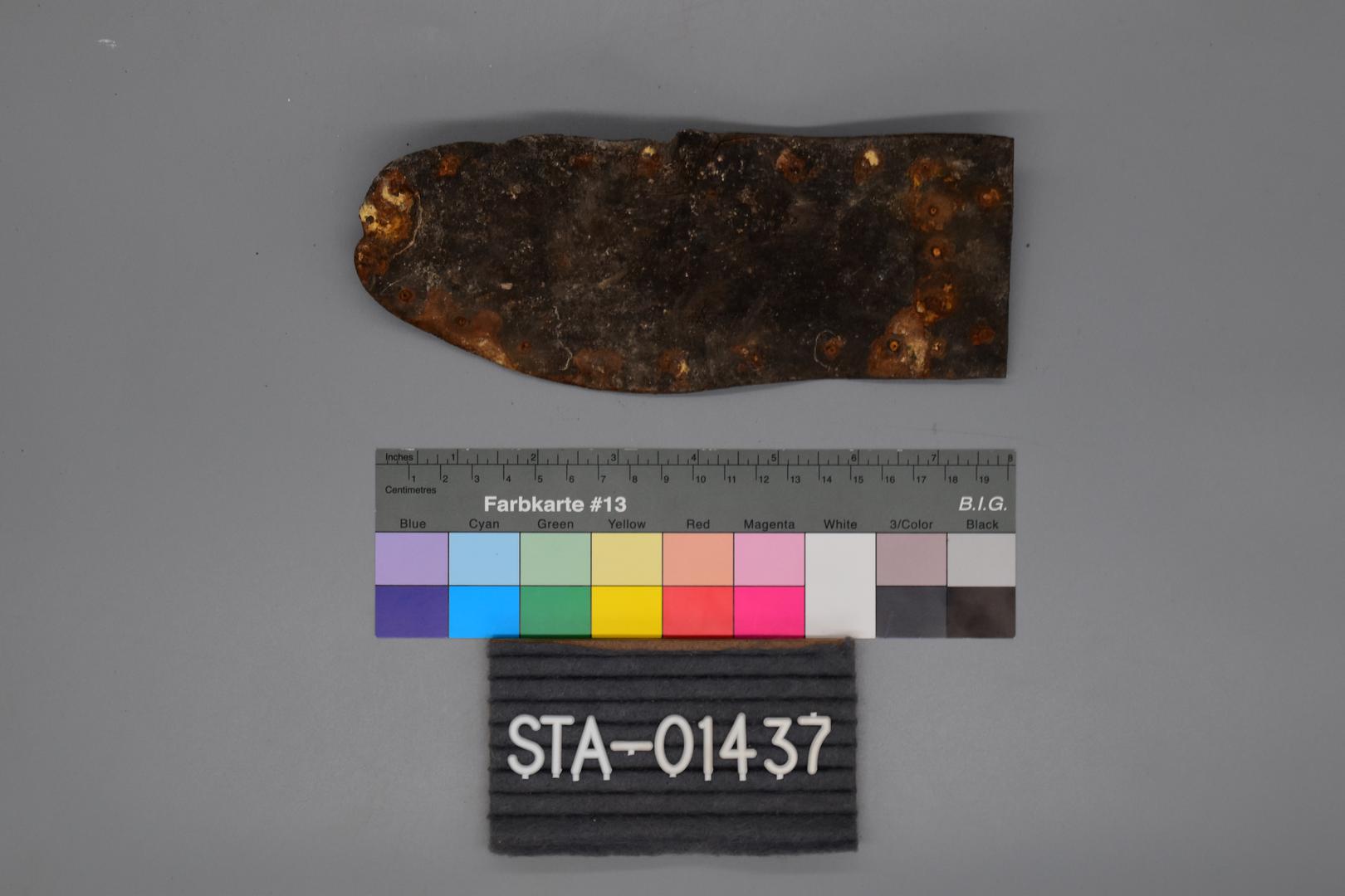 "de": "Ein Teil einer dunkelbraunen Schuhsohle. Die Sohle ist sehr schmal, vorne leicht abgerundet und nach hinten fast rechteckig verlaufend. Der hintere Teil fehlt und wurde gerade abgeschnitten. Es befinden sich noch Nägel und Nieten in der Sohle."