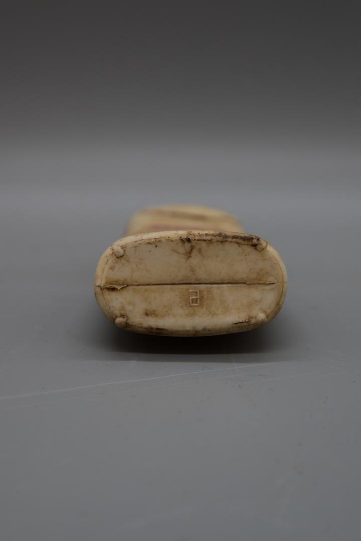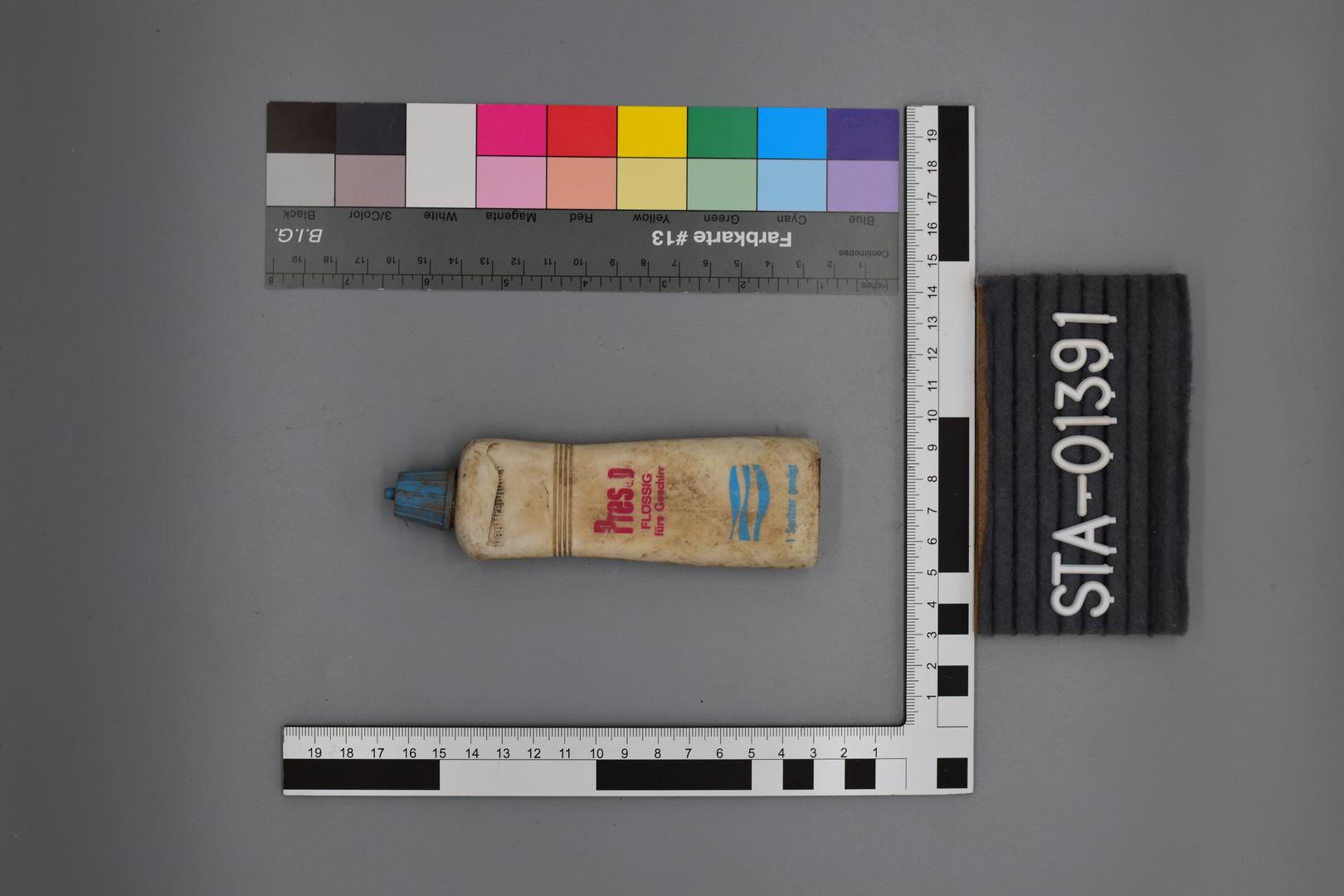 Die cremefarbene Flasche mit blauem und rotem Aufdruck besitzt eine blaue Verschlusskappe. Die Flasche ist mittig verjüngend und weitet sich nach unten leicht.