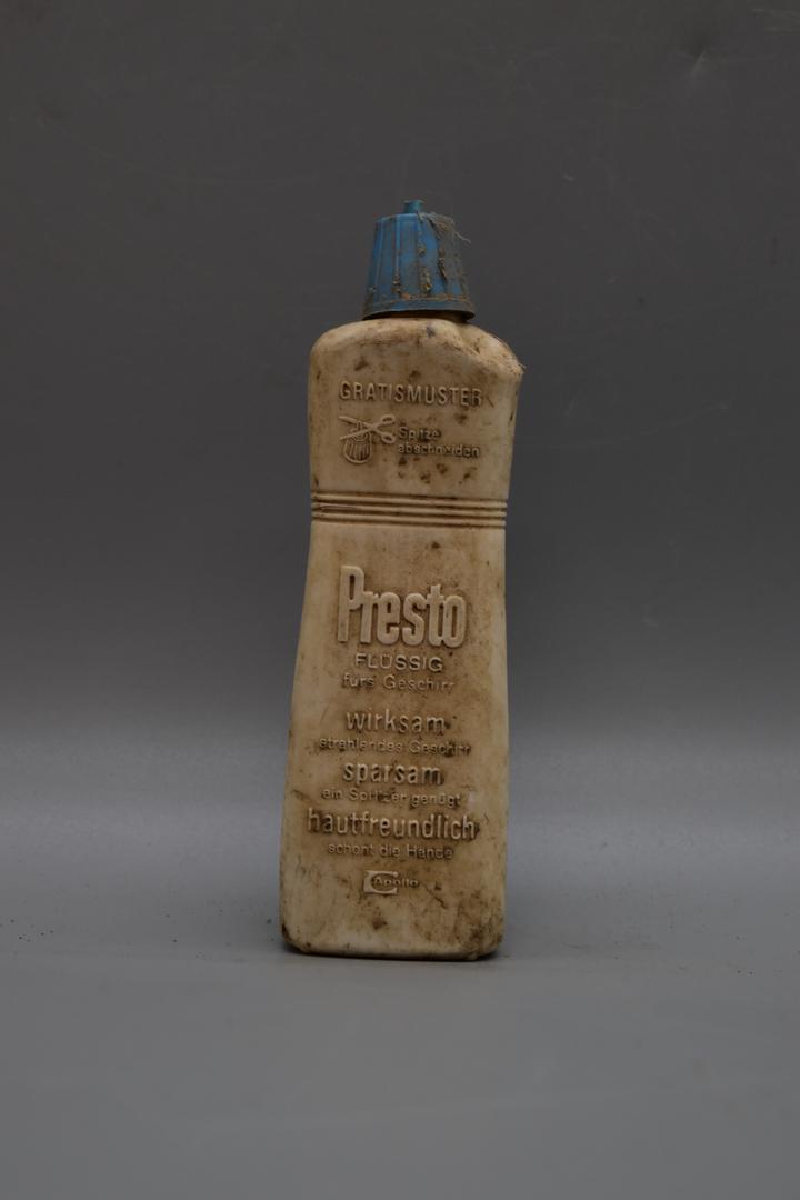 Kennzeichnung: "Gratismuster Spitze abschneiden" mit einem Druck einer Schere die die Spitze der Kappe abschneidet (Flaschenkörper), Kennzeichnung: "hautfreundlich", "Pres[...]o FLÜSSIG fürs Geschirr" (in rotem Druck), "1 Spritzer genügt" (blauer Druck mit Wellenmuster darüber), Kennzeichnung: "Presto flüssig fürs Geschirr - wirksam - strahlendes Geschirr - sparsam - ein Spritzer genügt - hautfreundlich - schont die Hände", Kennzeichnung: stilisiertes "C" und "Apollo"