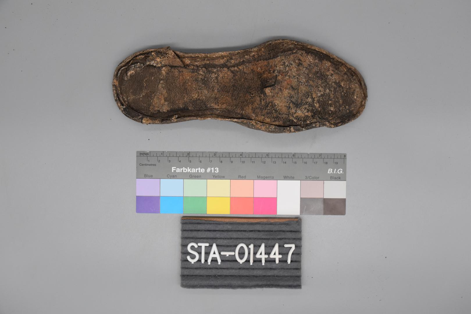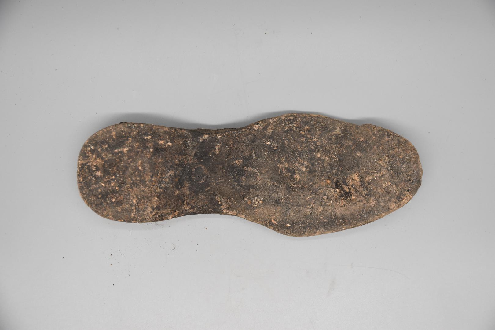 "de": "Eine dunkelbraune Gummischuhsohle. Die Sohle ist vollständig erhalten und recht schmal. Die Unterseite ist glatt, aber in der Mitte vor der Ferse weist die Sohle ein Linienmuster auf, und in der Mitte befindet sich ein vertiefter leerer Kreis."
