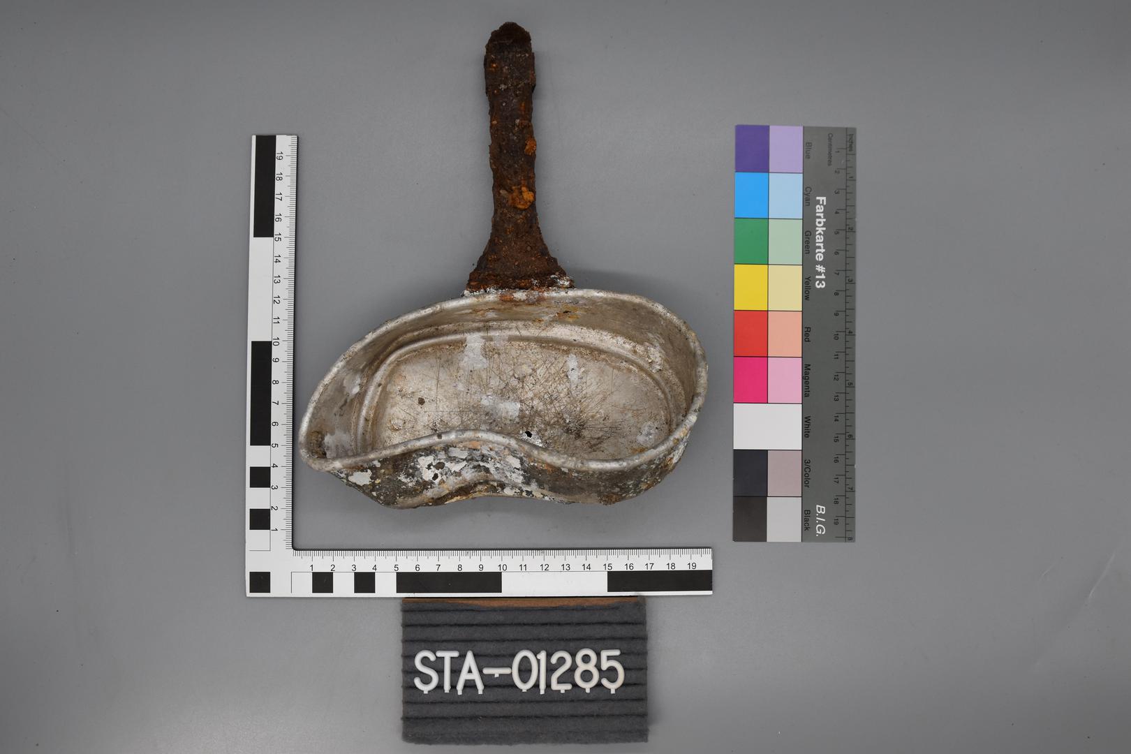 Die Schale besitzt einen Griff. Die Form der Schale ist oval und hat einen abgesetzten, flachen Boden. Der Rand ist umgeschlagen und gedrückt. Der Griff ist rechteckig geformt und das Ende ist rechtwinkelig und gespitzt nach oben gebogen. Die Schale ist der Deckel eines militärischen Essgeschirrs.