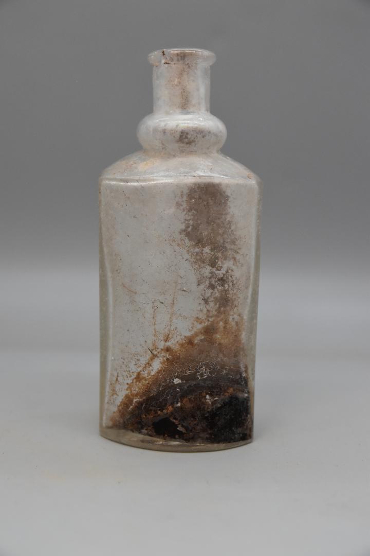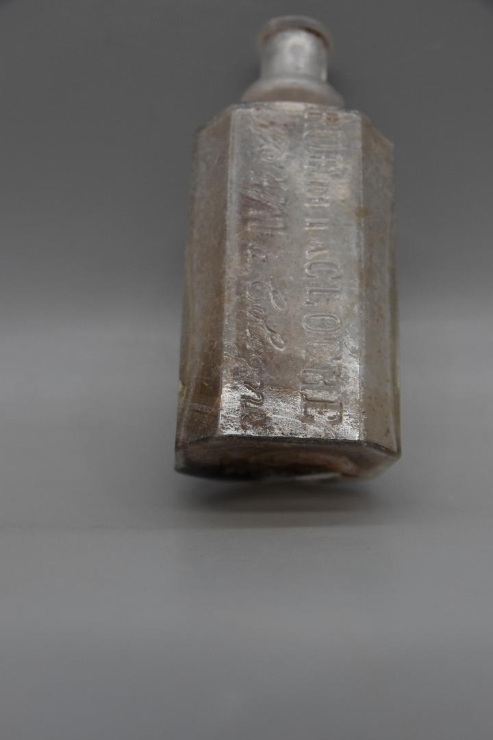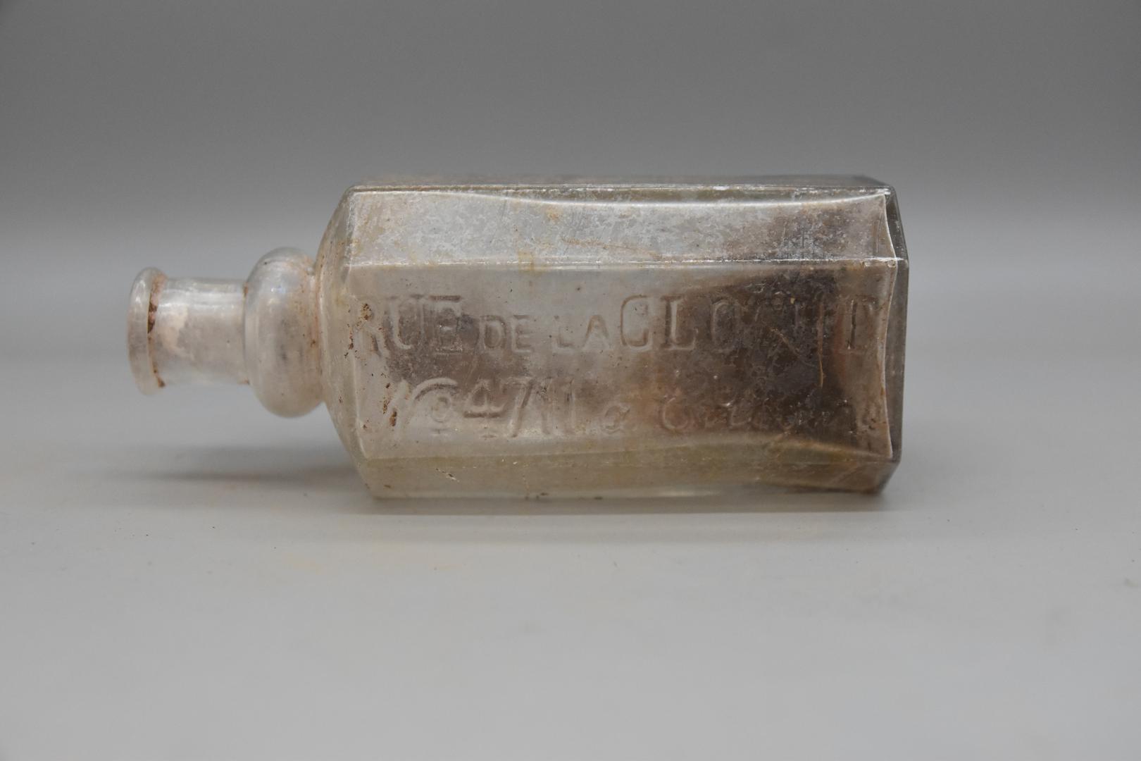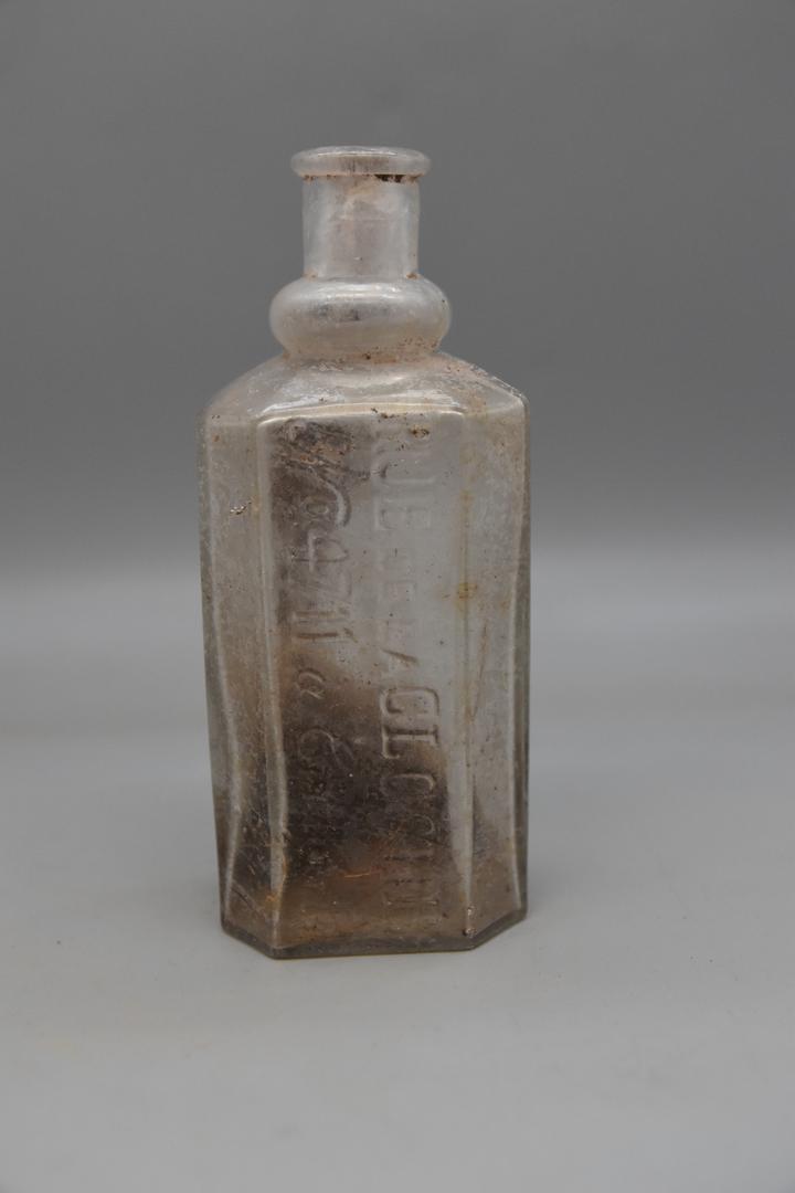 Die Parfümflasche ist sechseckig geformt. Die Lippe ist leicht abfallend und dick, der Hals hat eine dickere Wulst und die Schultern fallen leicht nach unten und sind abgesetzt vom Körper. Eine Seite des Körpers ist kantig und die andere nach außen gewölbt. Der Boden ist leicht konkav und besitzt einen breiteren Standring. Es ist eine Kölnisch Wasser Flasche.