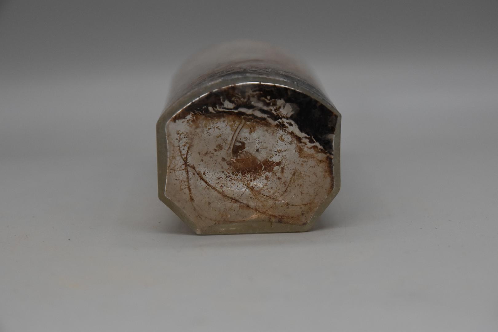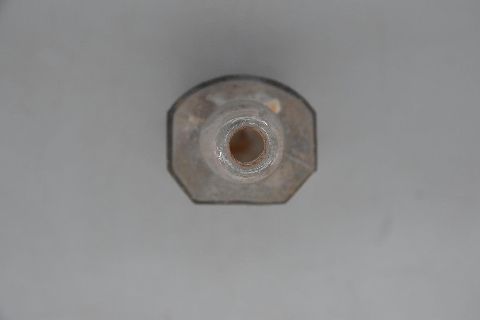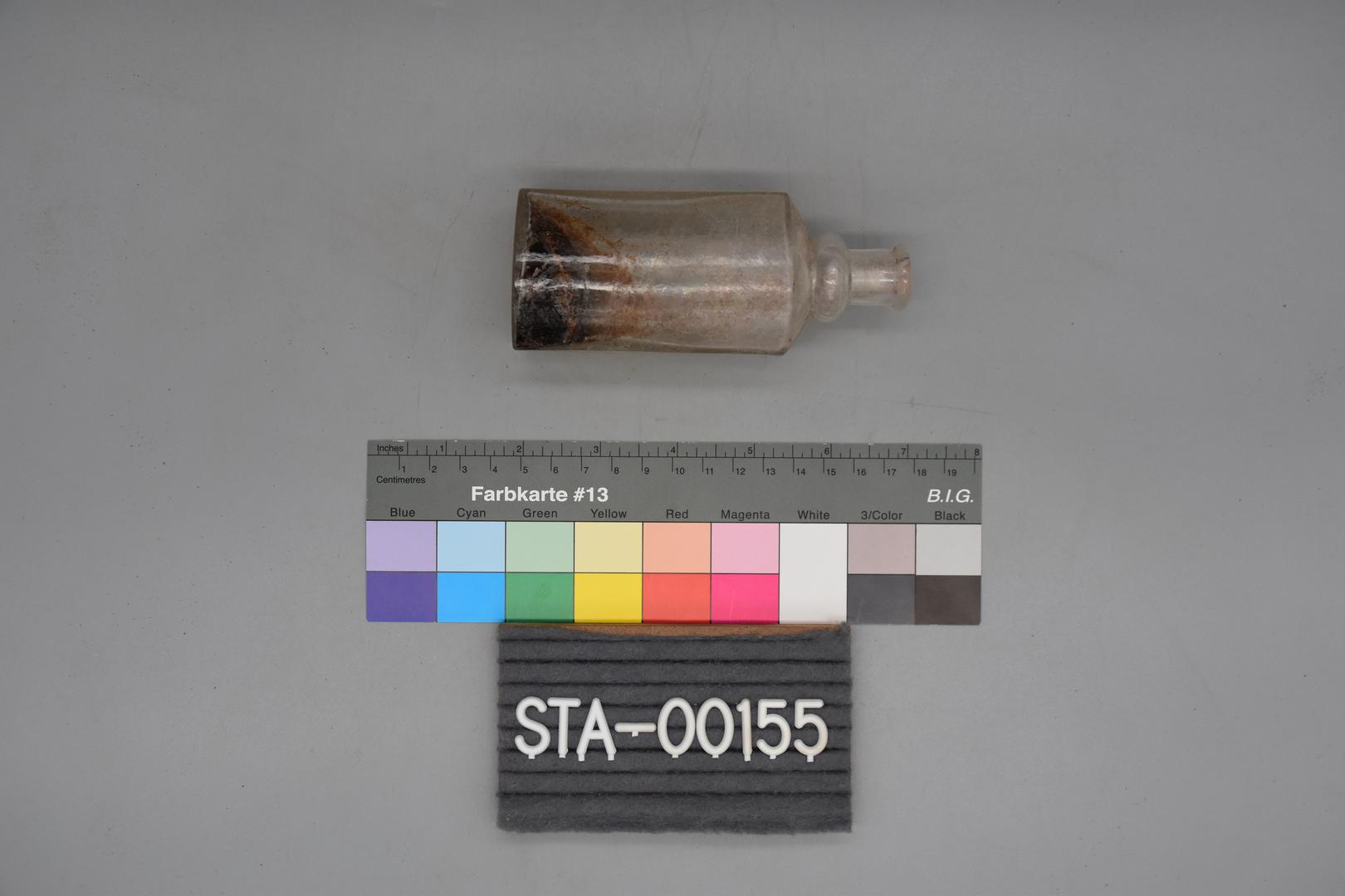 Die Parfümflasche ist sechseckig geformt. Die Lippe ist leicht abfallend und dick, der Hals hat eine dickere Wulst und die Schultern fallen leicht nach unten und sind abgesetzt vom Körper. Eine Seite des Körpers ist kantig und die andere nach außen gewölbt. Der Boden ist leicht konkav und besitzt einen breiteren Standring. Es ist eine Kölnisch Wasser Flasche.