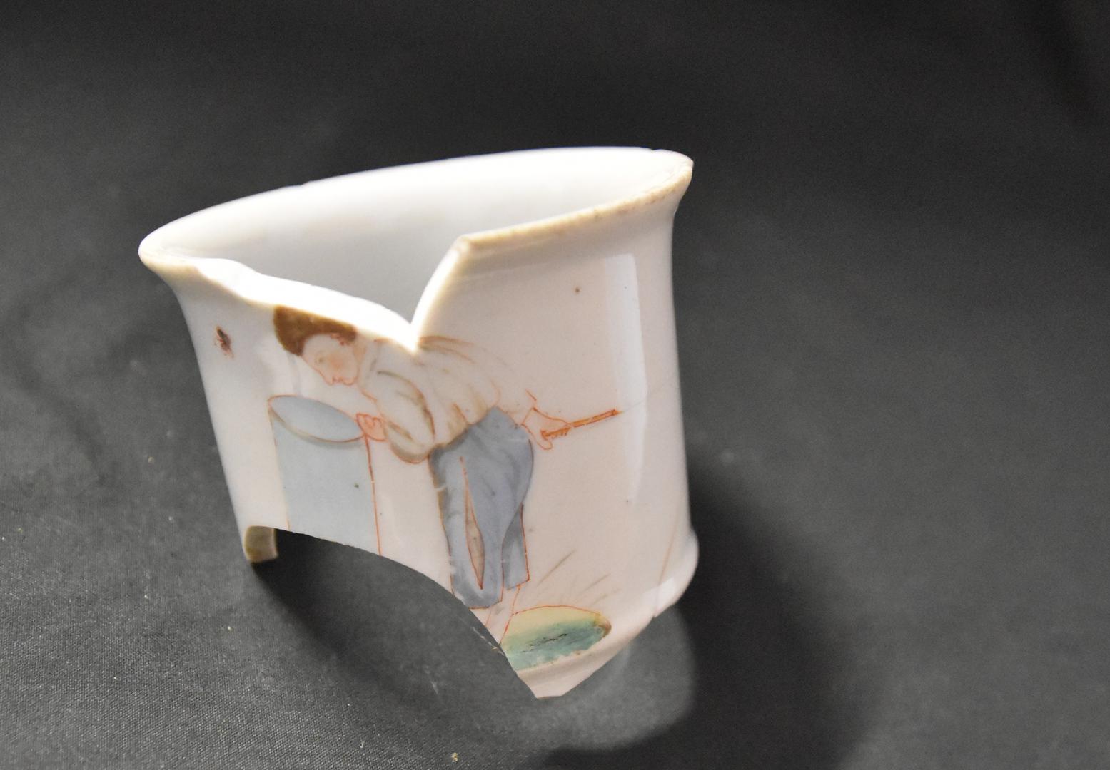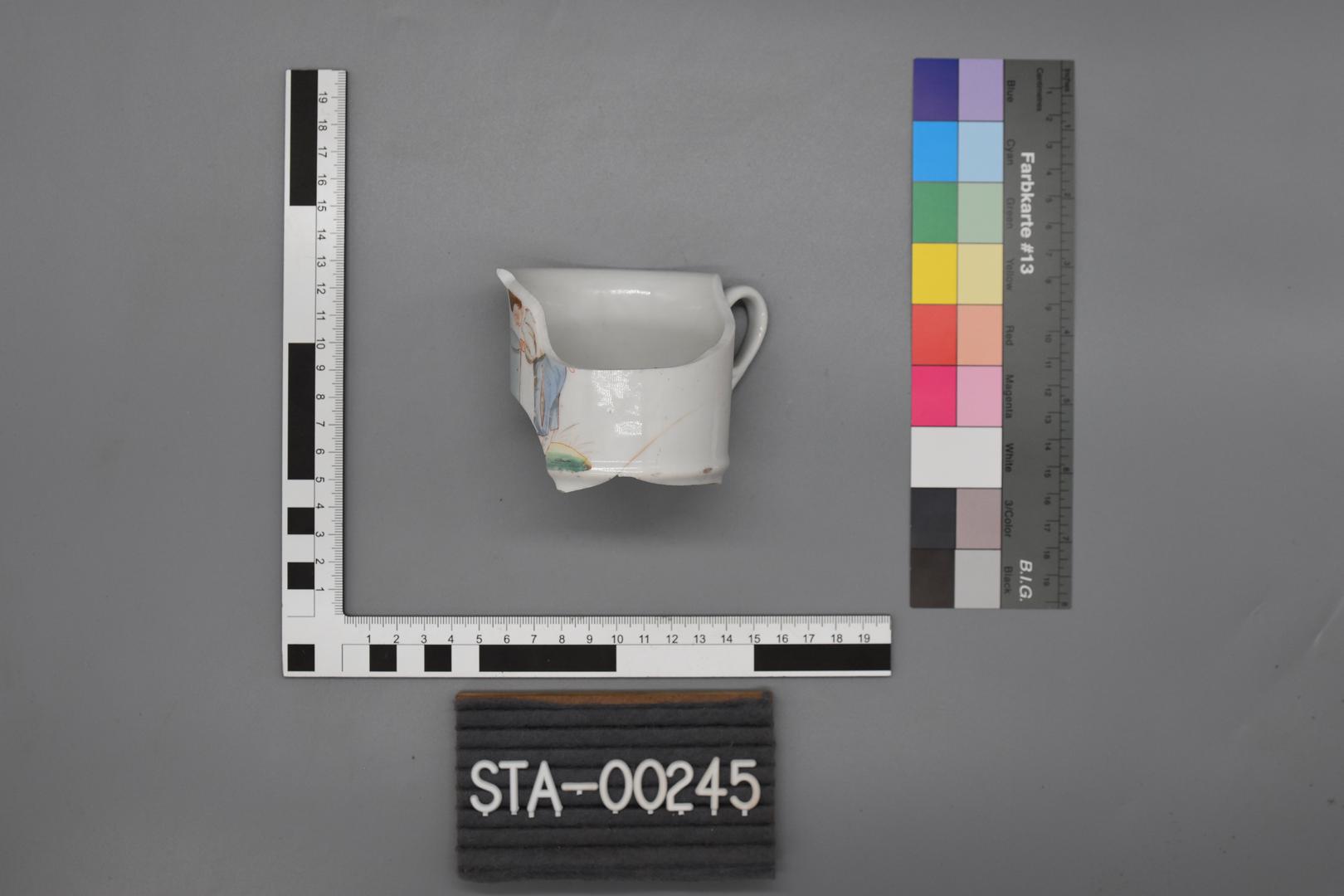 "de": "Der Henkel ist ohrenförmig. Die Tasse hat zwei Bruchstücke, die nicht zusammengefügt wurden und separat in die Sammlung aufgenommen wurden. Dies ist das Stück, dass das meiste der Darstellung zeigt. Man sieht darauf eventuell eine Märchendarstellung? Der Rand ist flach ausladend. Nach unten verjüngt sich die Tasse leicht. Der Junge steht nach links gedreht.Der Oberkörper ist leicht vorgebeugt, und er schaut in eine zylindrische Form, die ein Netz darstellen könnte. Die linke Hand sieht man neben dem Netz liegend, in der rechten Hand hält er einen braunen länglichen Gegenstand (Stiel). Der Junge hat braune kurze Haare, er trägt ein weißes Hemd, eine blaue Kniehose und unten neben ihm ist ein grün, blau und gelblicher Untergrund zu sehen. Womöglich stellt der Untergrund Gras, einen Hügel oder eine Wasserfläche dar."