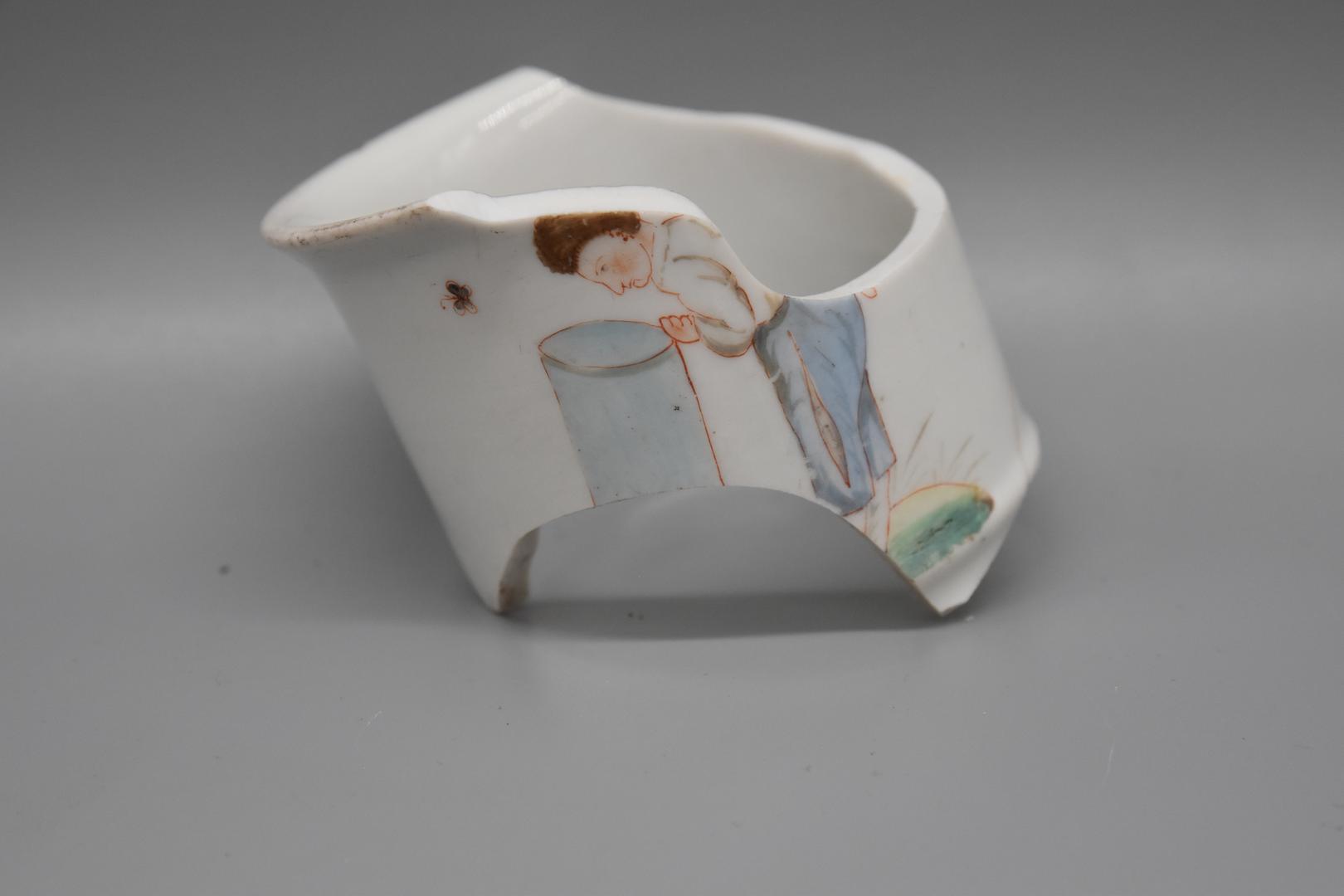 "de": "Porzellantasse mit einer Jungendarstellung. Es ist vermutlich eine Tee- bzw. Kaffeetasse. Sie hat eine weiße Grundfarbe und ist glasiert. Der Dekor besteht aus einem Jungen, der in der Hand einen Stiel hält, an dem ein Netz befestigt ist und er sieht in das Netz hinein. Es könnte sich um eine Fischerei Szene handeln, aber auch den Jungen beim Insektenfangen zeigen. Möglicherweise ist es auch eine Märchendarstellung."