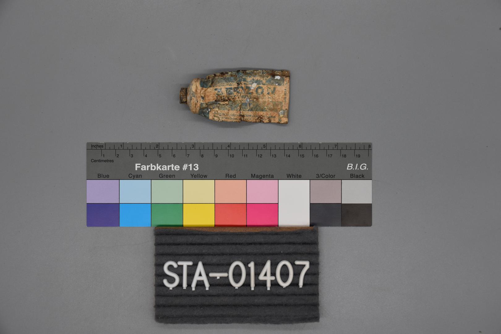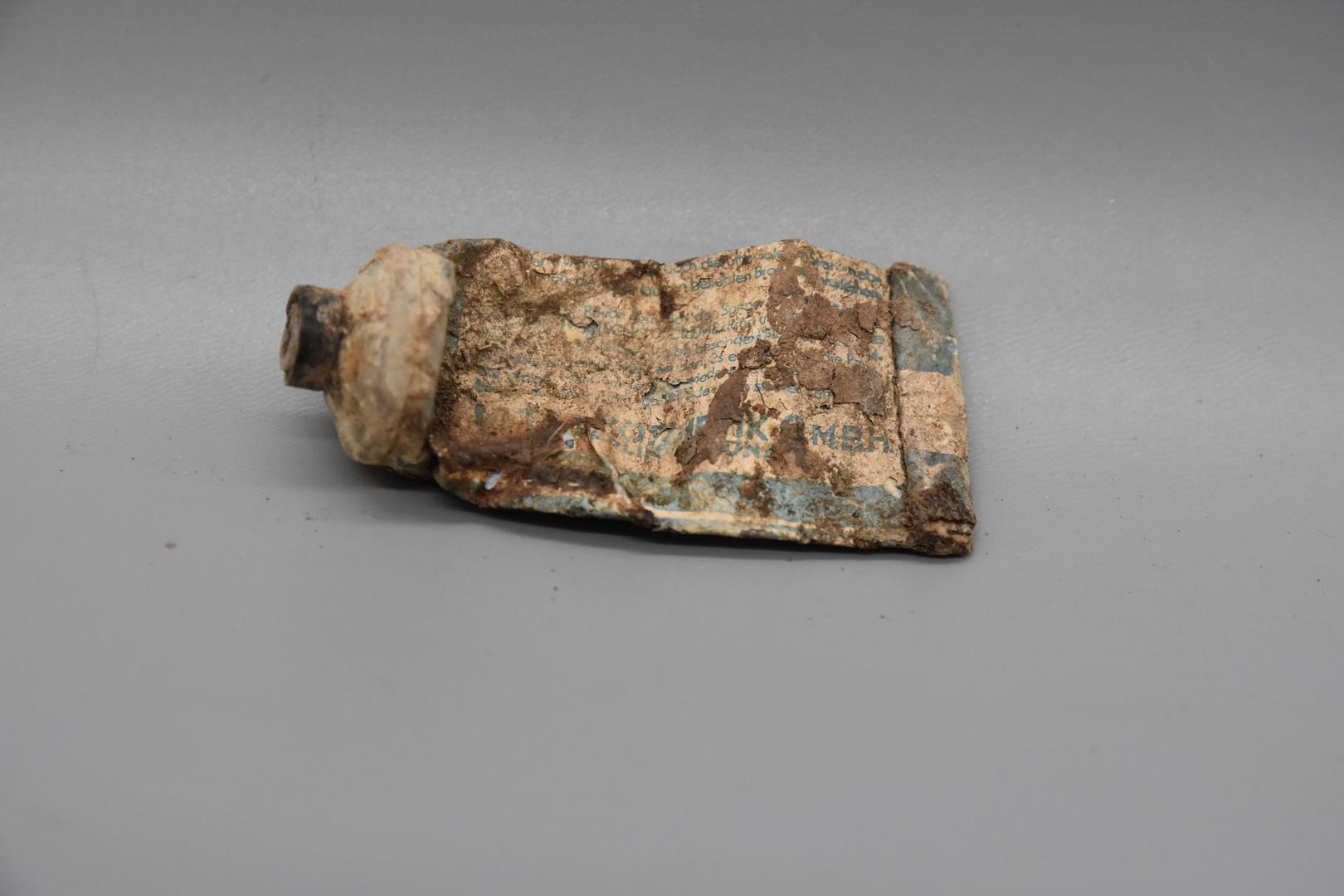 Die Tube ist rechteckig, blau und cremefarben. Auf dem Schraubverschluss ist noch ein Teil der Kappe erhalten, aber der obere Teil fehlt.