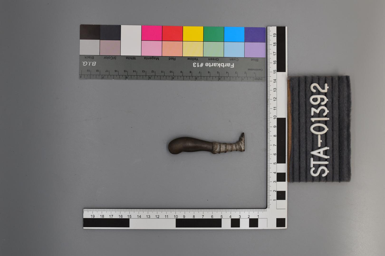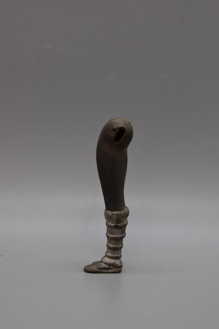 Es handelt sich um ein Puppenbein aus Kunststoff. Das Bein ist leicht muskulös geformt, und grau und silber bemalt. Es hat einen festen Schuh dargestellt der bis unter das Knie reicht. Das Bein hat oben zwei Löcher, eines rechteckig und das andere fast quadratisch.