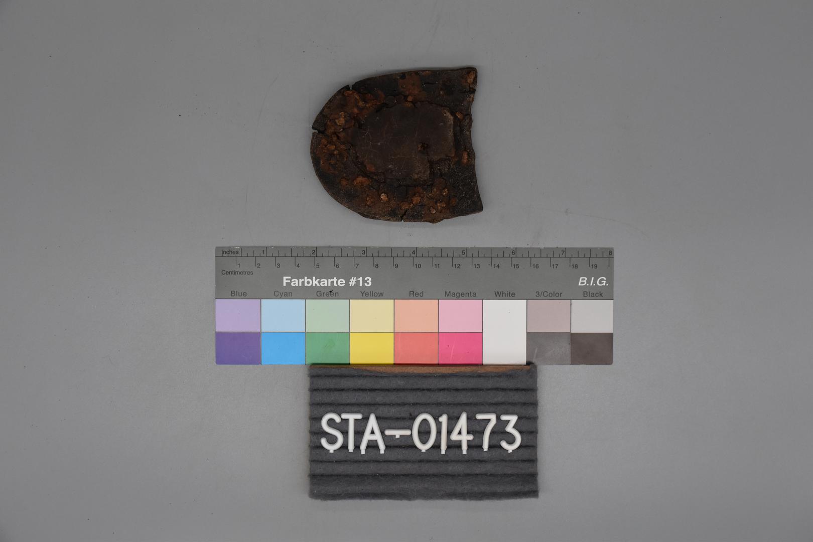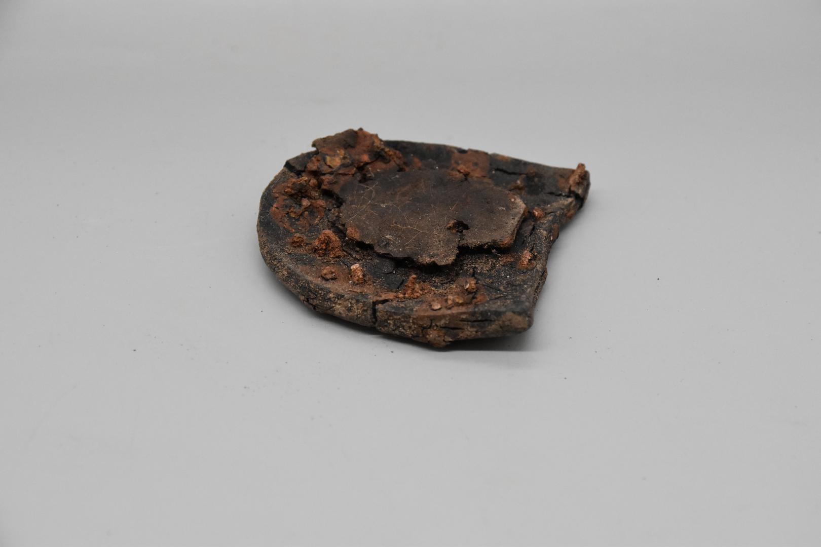 "de": "Die schwarze Schuhsohle ist hufeisenförmig und besitzt auf der Oberseite noch einen dunkelbraunen Lederrest. Der Absatz ist niedrig. Es befinden sich Löcher und Nägel im Absatz."