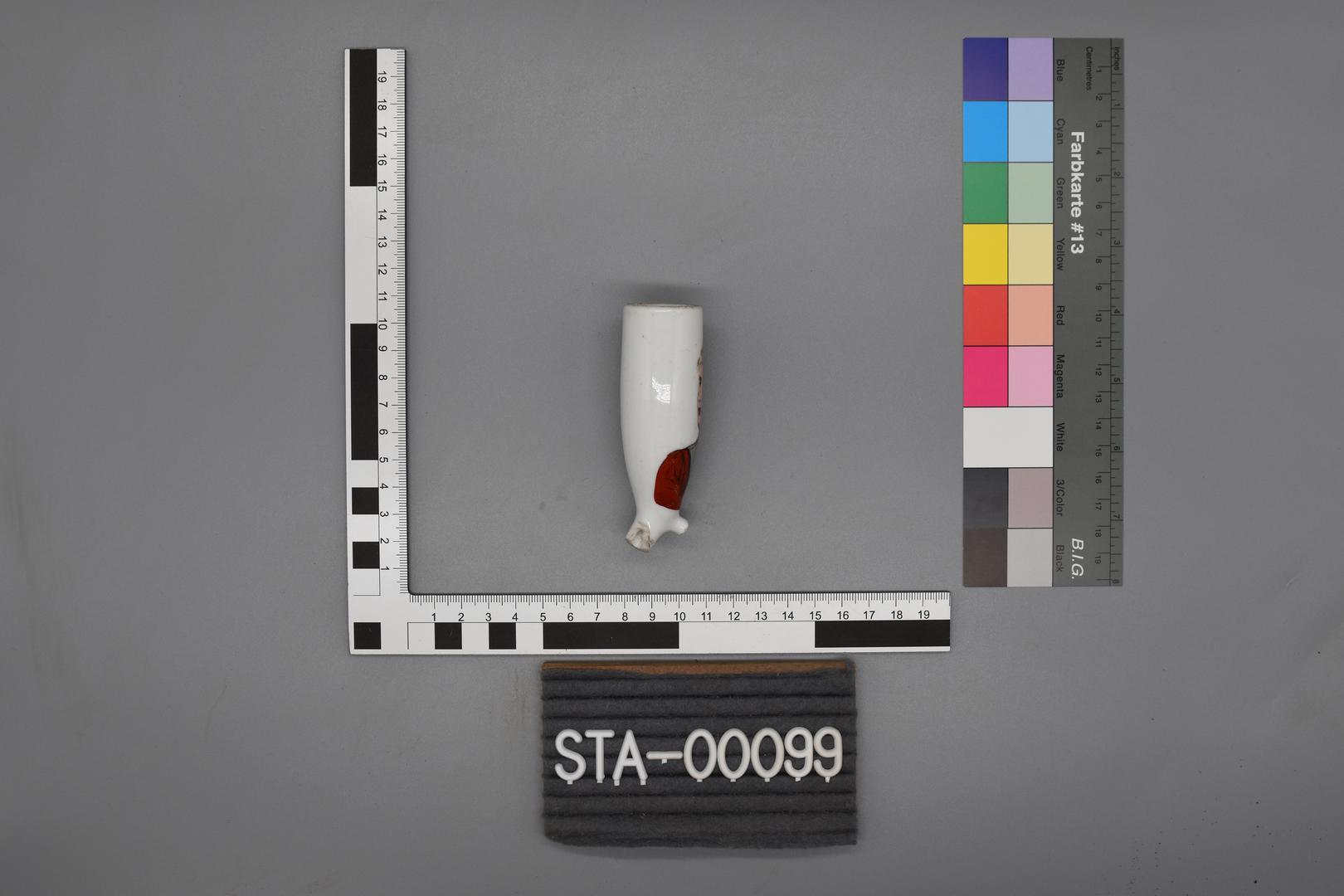 - Unterer Ansatz der Pfeife ist gebrochen. Auf dem Anhänger ist ein Motiv aus Linien erkennbar.
